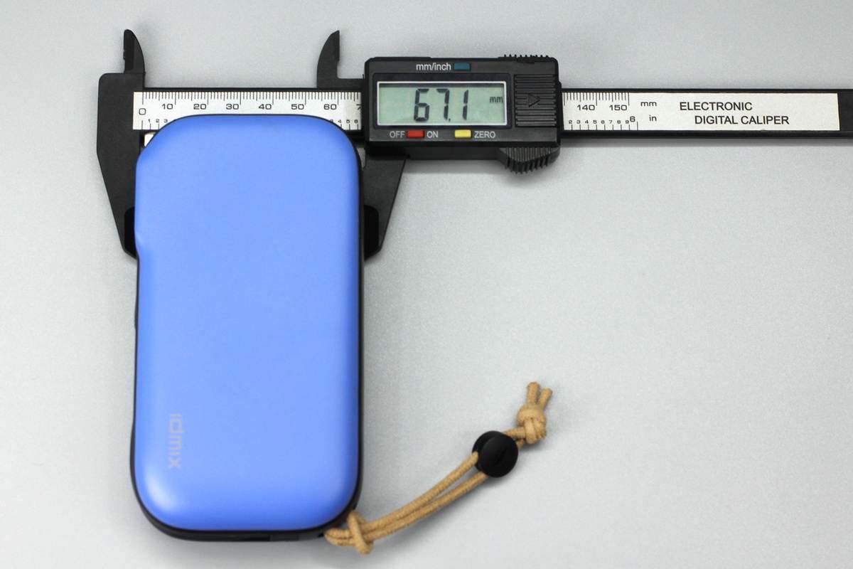机身厚度比一元硬币直径稍大一点,此外侧身黑色外壳两端宽度不一样,作为获得红点奖的产品,设计的确很有特色,加上蓝色正背面外壳,个性鲜明。