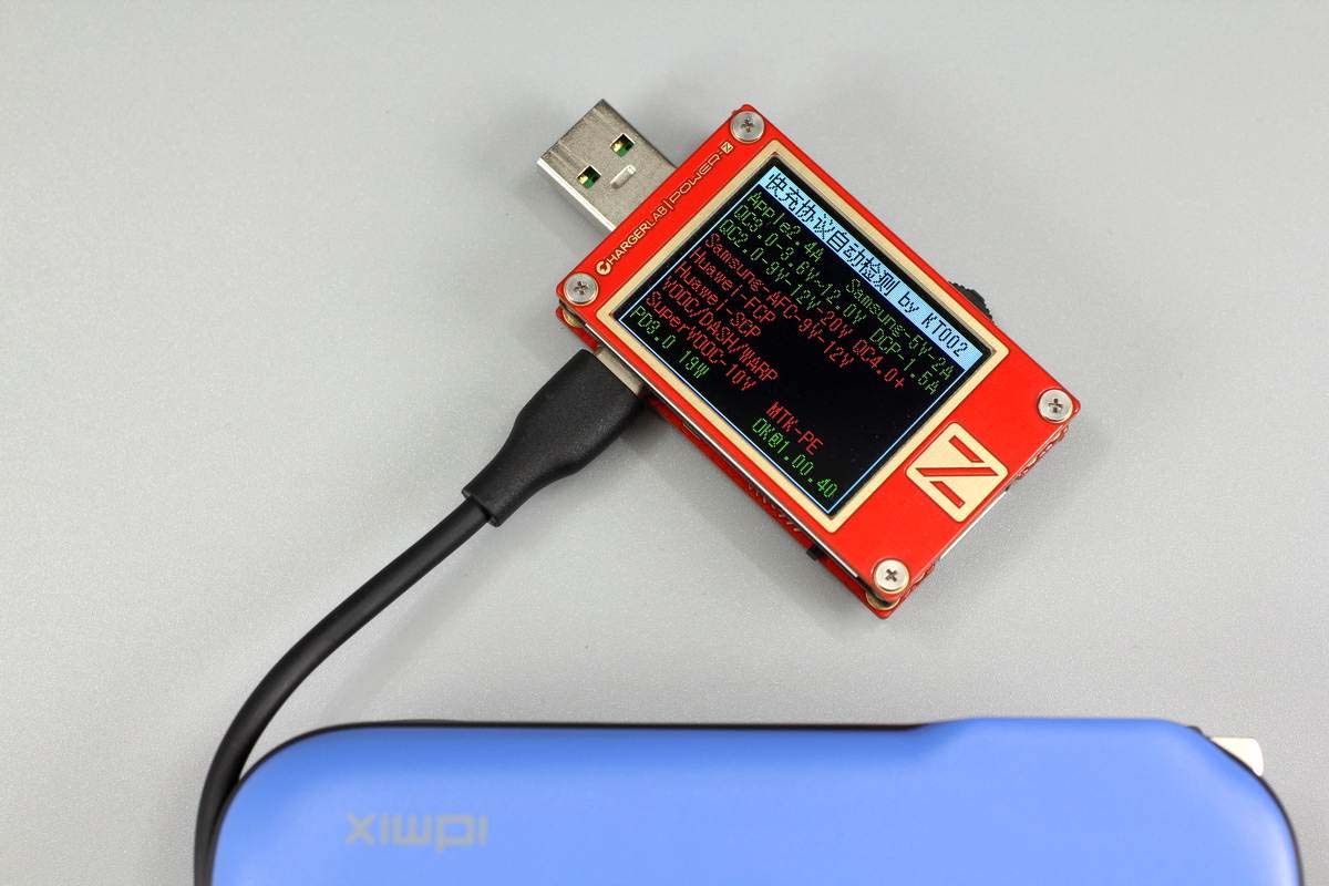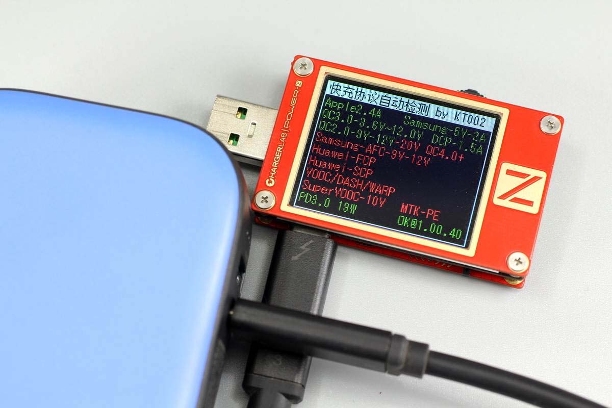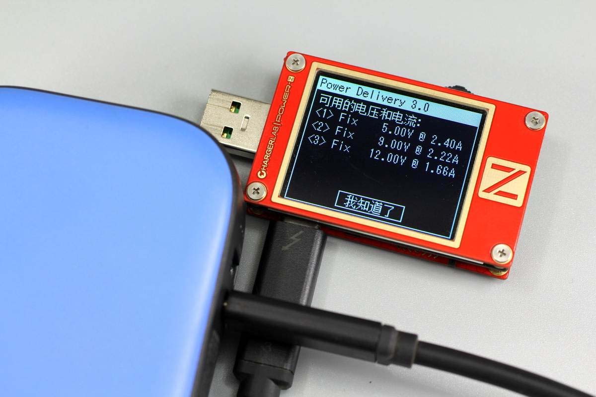 移动电源模式下,使用ChargerLAB POWER-Z KT002测得USB-A口支持Apple 2.4A、Samsung 5V2A、DCP协议,以及QC2.0、QC3.0快充协议。