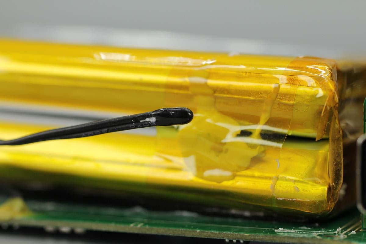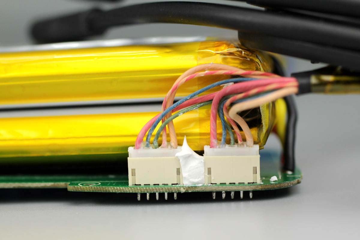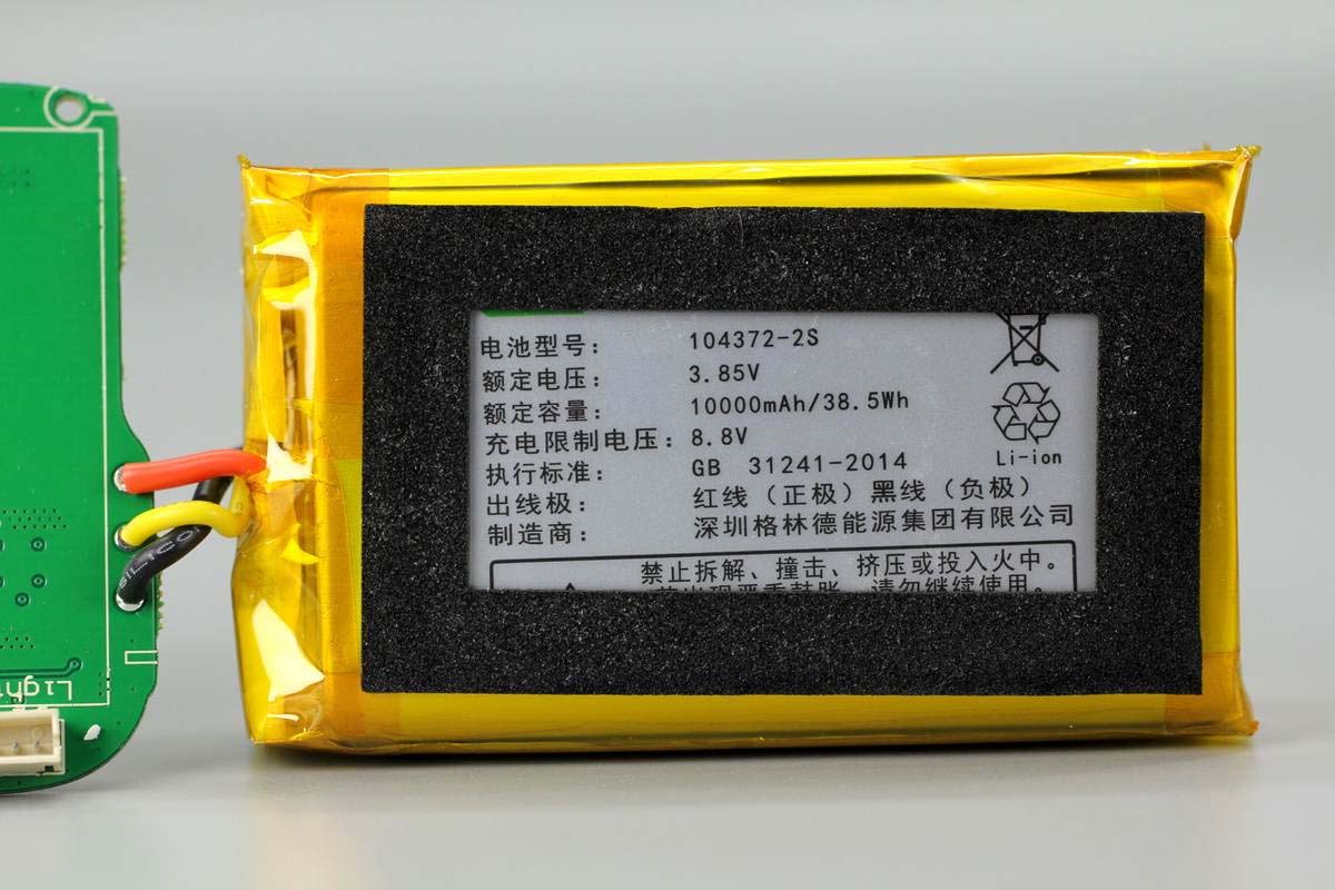 电芯包裹绝缘胶带,并贴有泡棉保护。电芯来自深圳格林德能源集团有限公司,额定电压3.85V,额定容量10000mAh/38.5Wh,充电限制电压8.8V,红线为正极,黑线为负极。