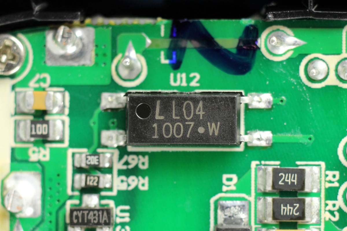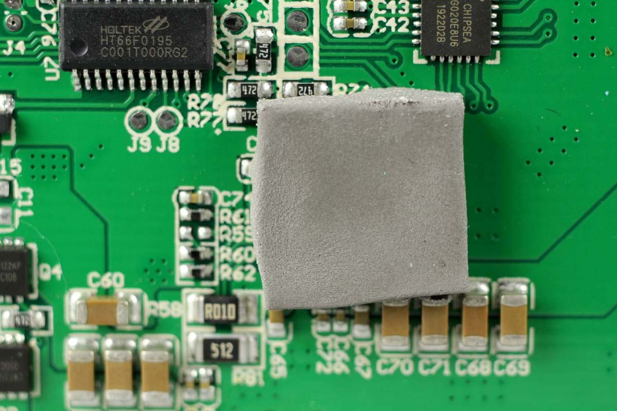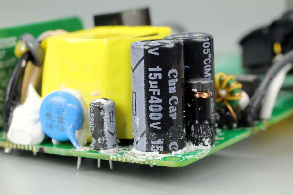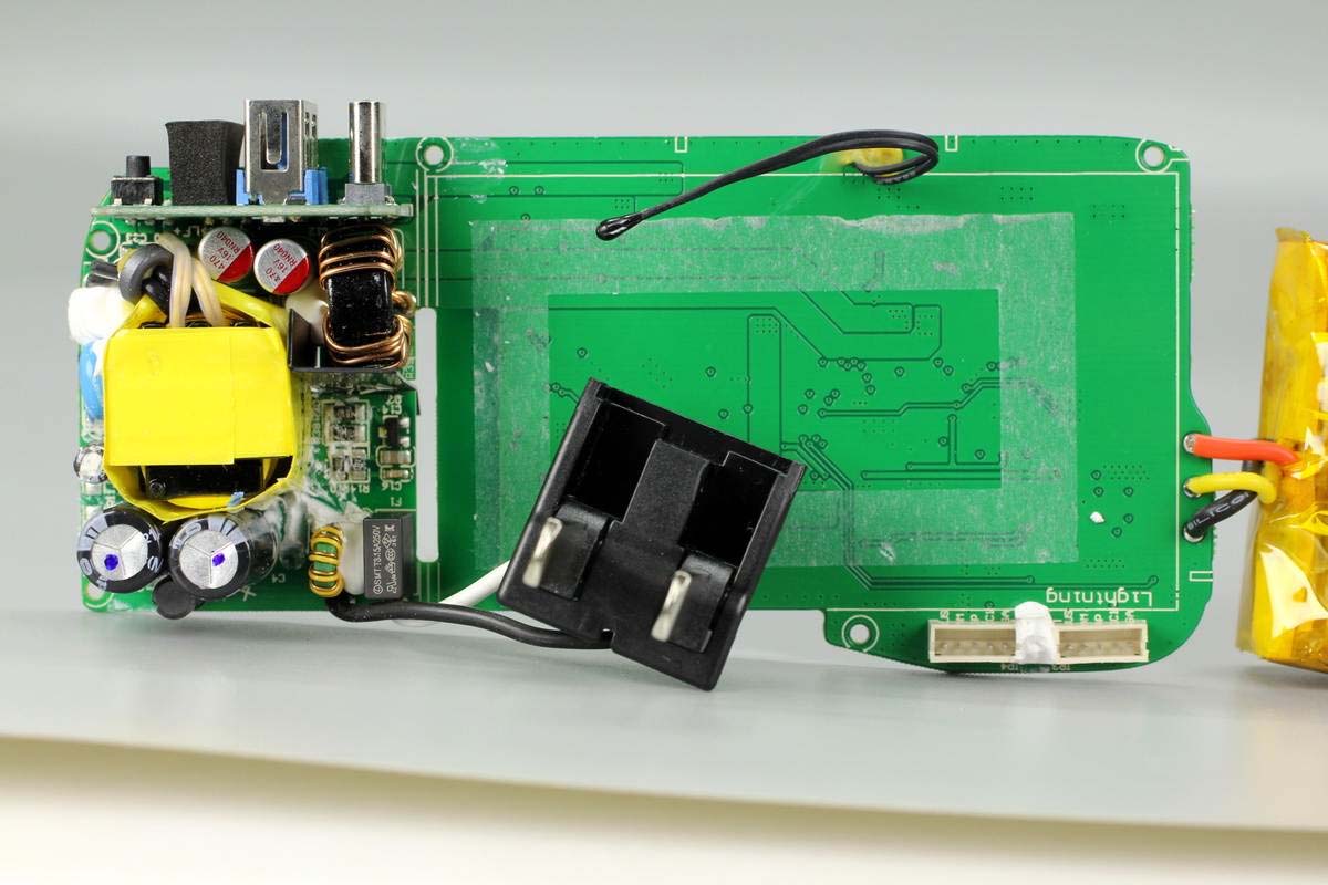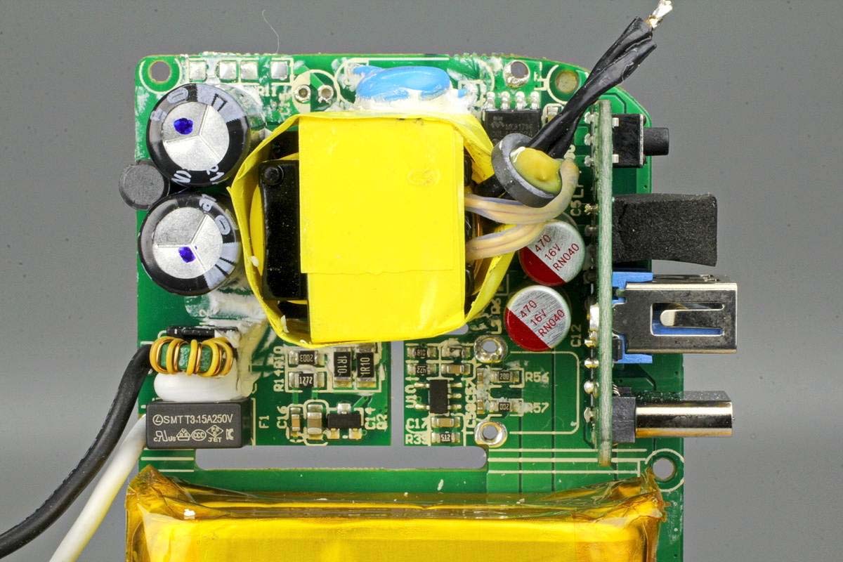 PCB板另一面,左端设有充电器的电容、变压器等元器件。