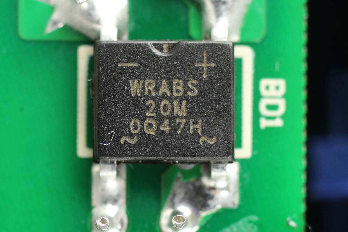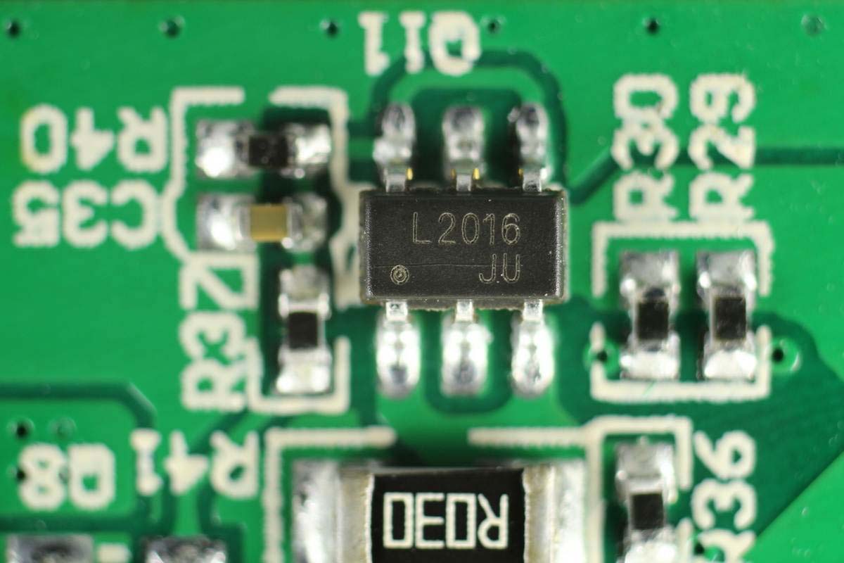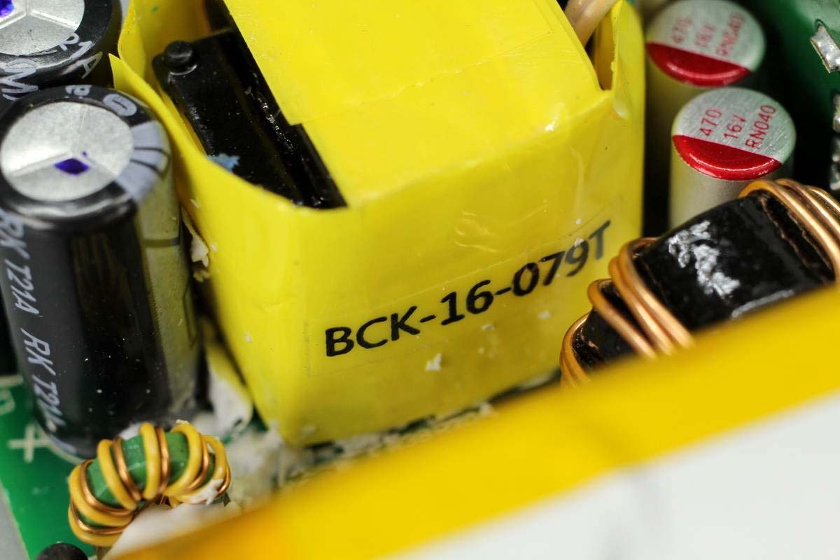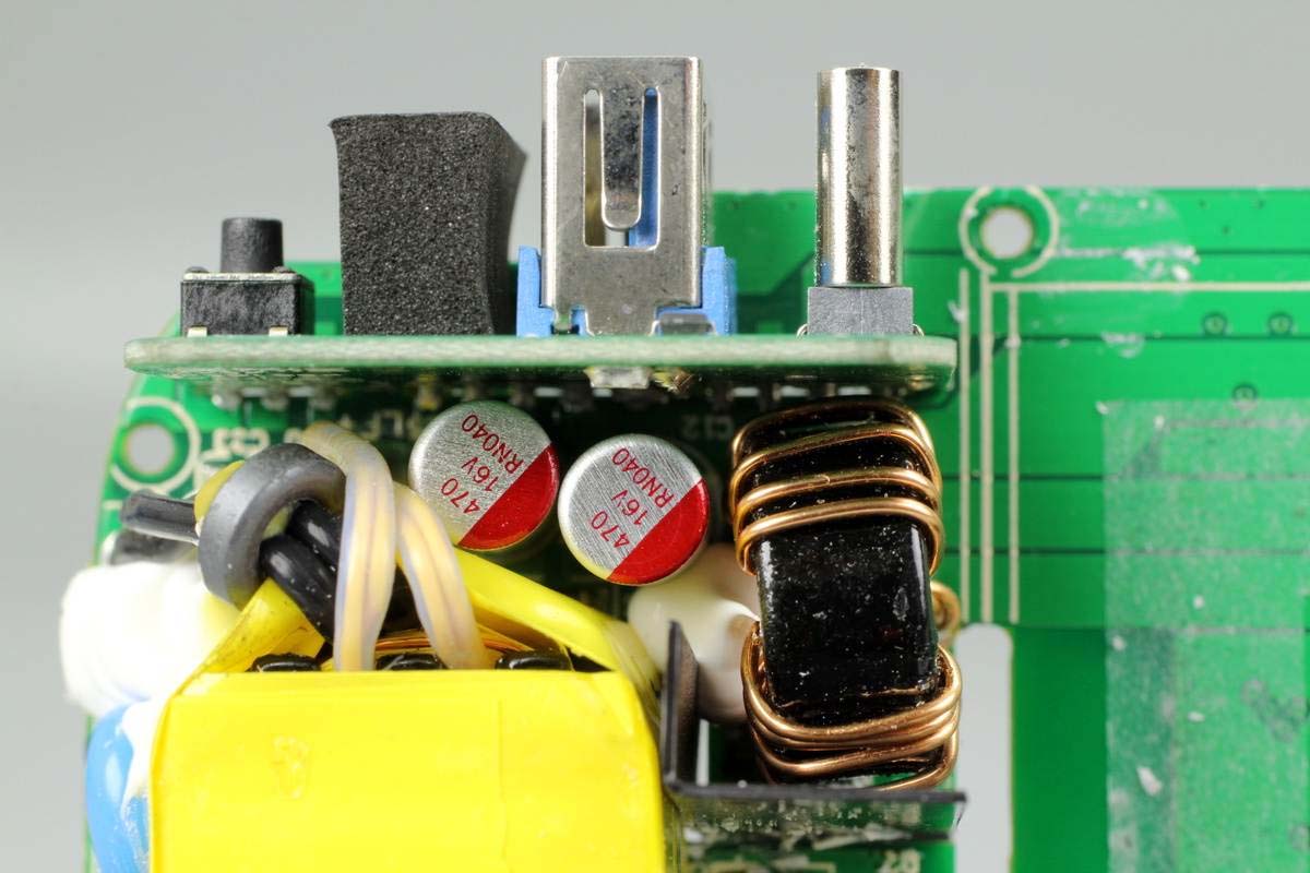 两颗输出滤波固态电容规格均为16V 470μF,右侧还有一颗滤波电感。