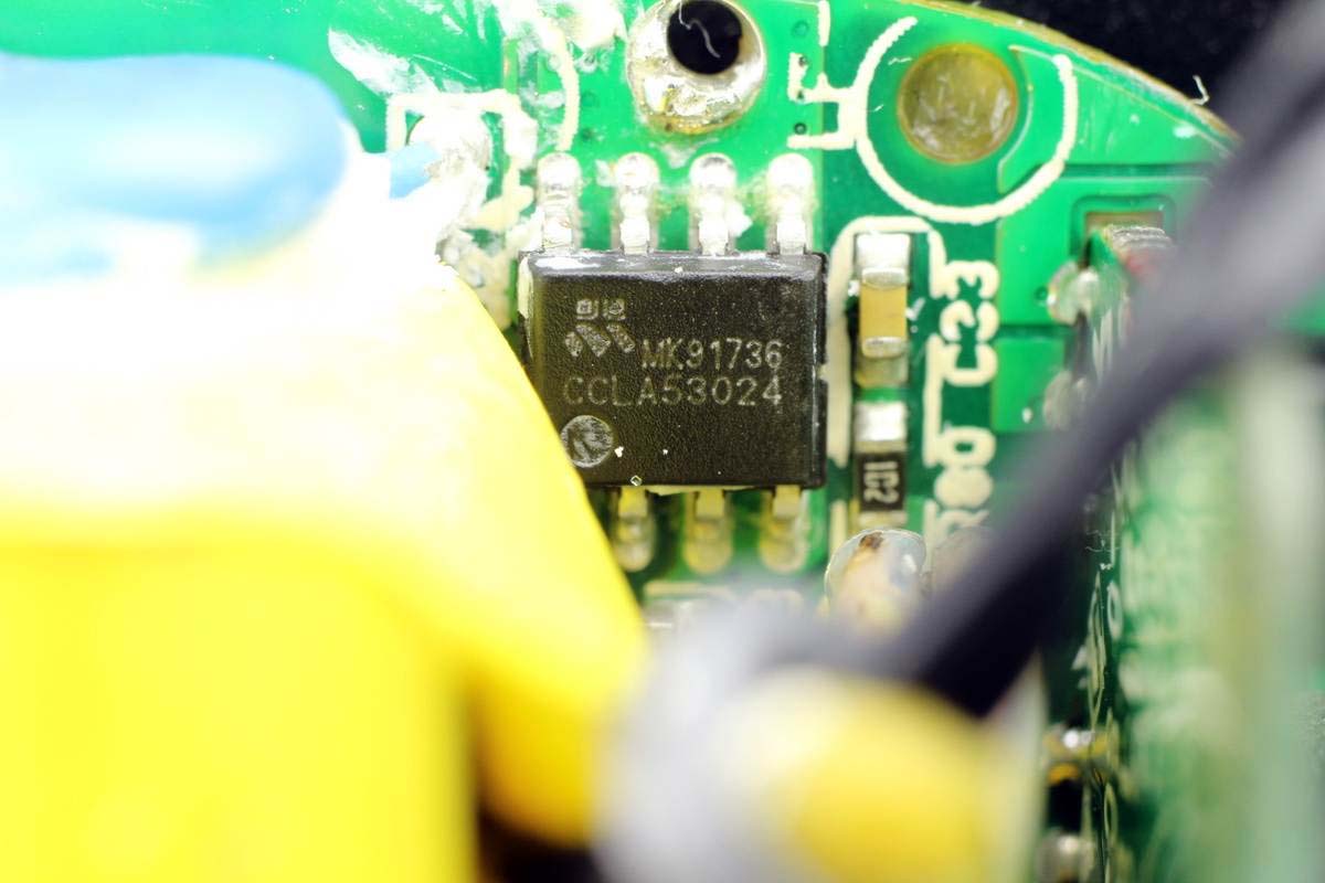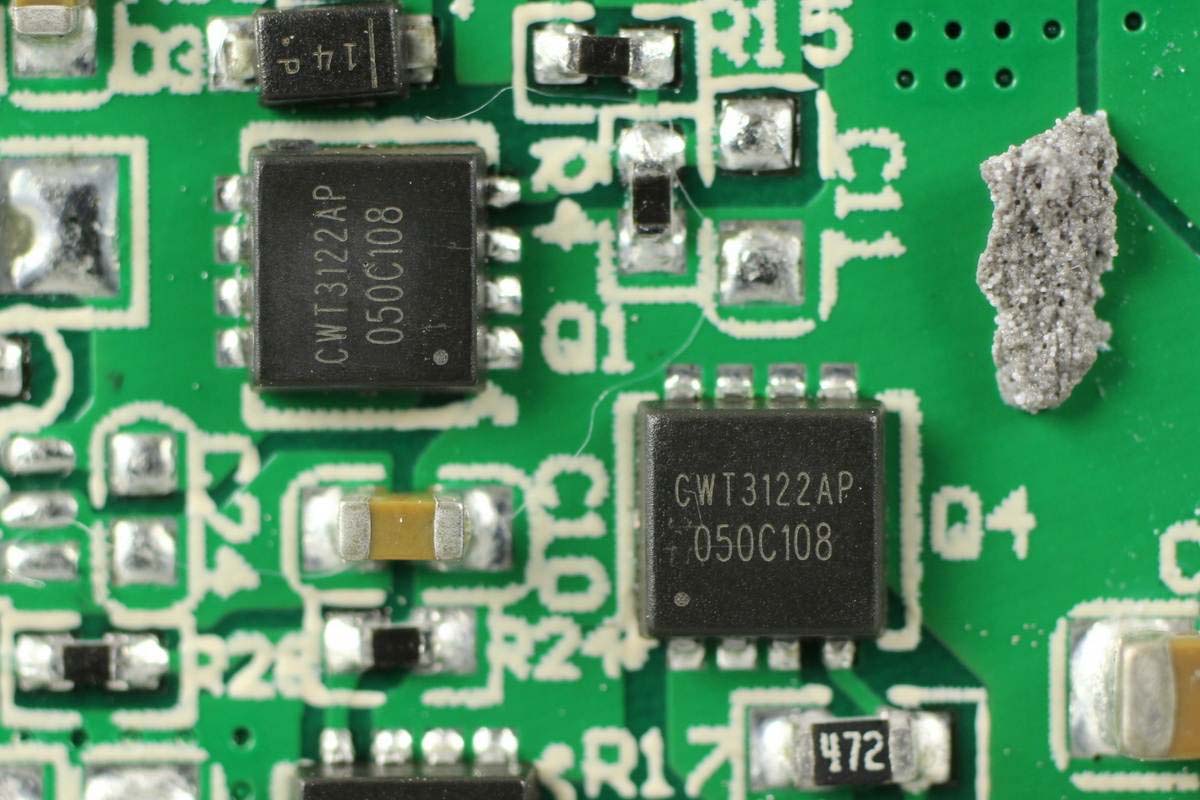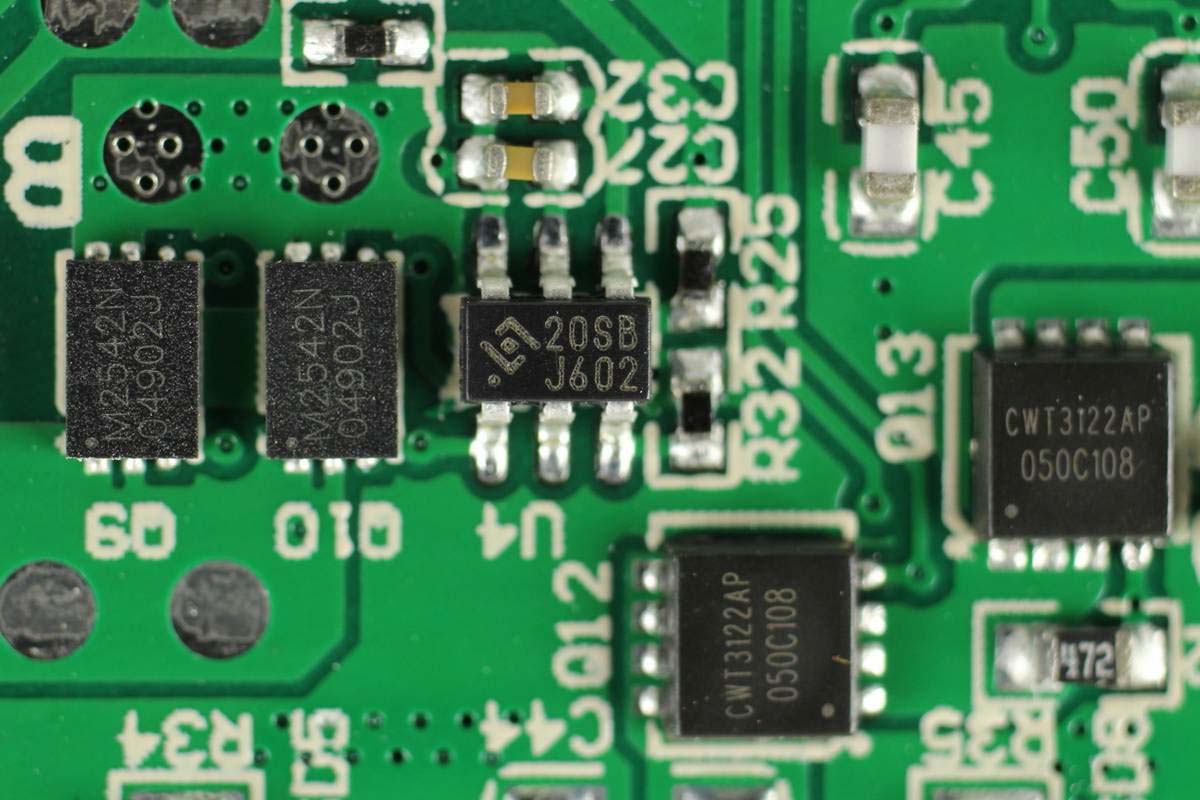 丝印20SB锂电池保护芯片,来自HYCON宏康,左边是两颗锂电保护MOS管,右下角两颗用于线缆输出保护。