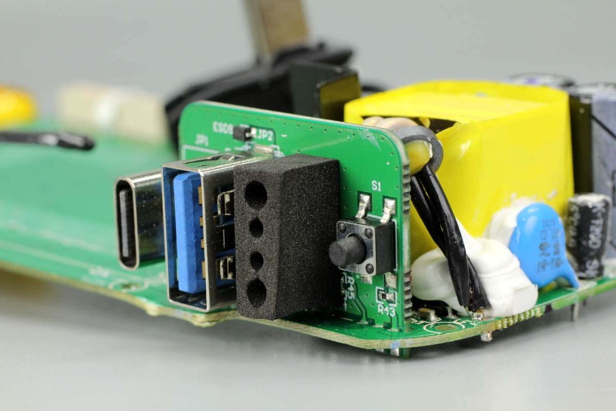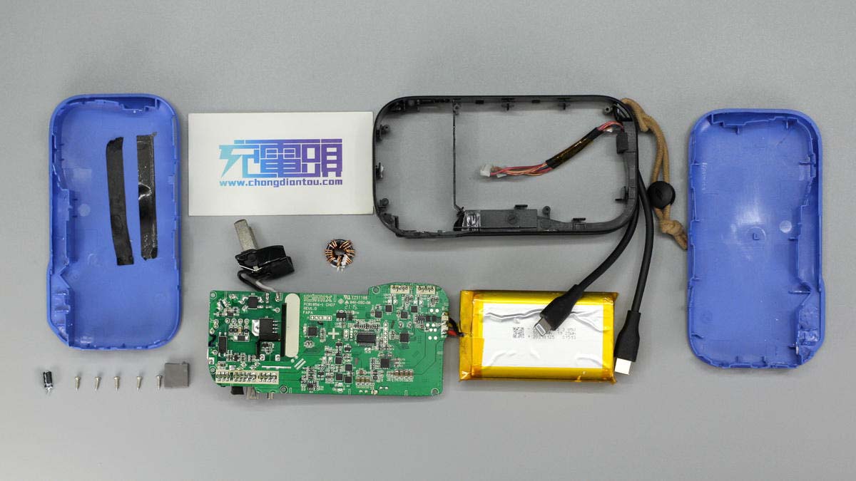 内部PCB板使用螺丝进行固定,左侧是充电器电路,右侧是移动电源电路,两者间有隔离板进行隔离。