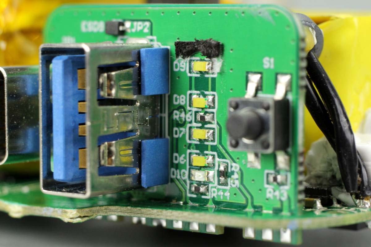 输出端设有一块小板,两个USB母座垂直焊接在小板上,LED灯上盖有泡棉防串光。