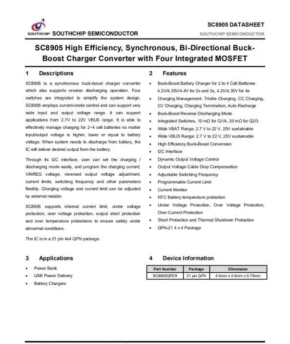 南芯SC8905是一颗双向同步升降压转换器,内部集成了4颗低Rdson功率管,转换效率超高以减少热损耗,同时可以最大尺度减小外围器件BOM,优化PCB空间及成本。该芯片使用电流控制模式,支持超宽的2.7V至22V电压输入,可有效管理2节至4节电池的充电;当系统需要从电池获取能量时,可实现电池反向放电功能。