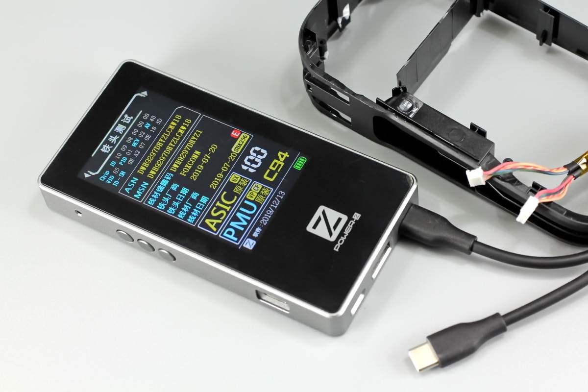 最后使用MF001测试仪对Lightning线的端子进行测试,测得ASIC、PMU均为原装C94元件,评分为100分,生产日期在2019年12月13号。