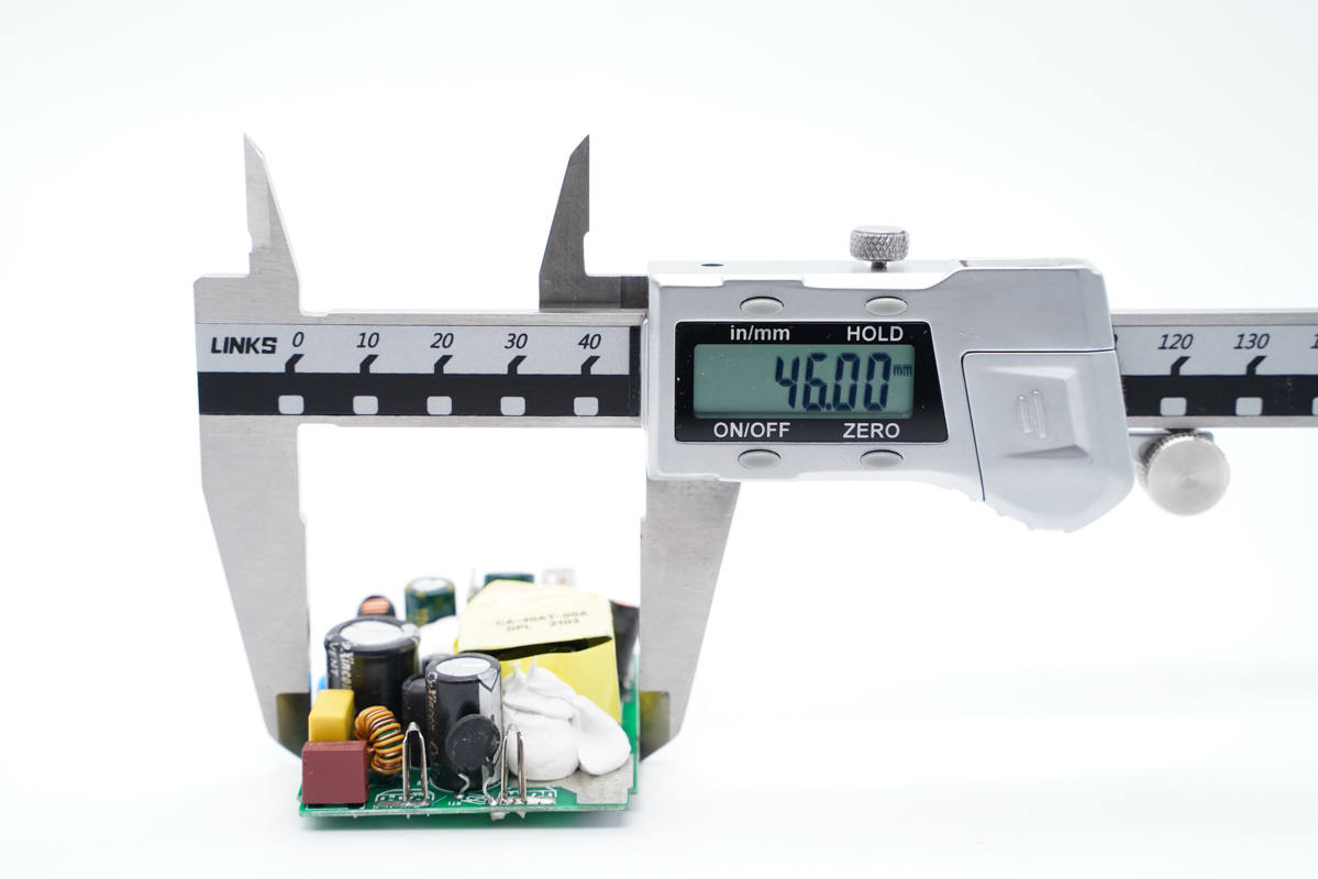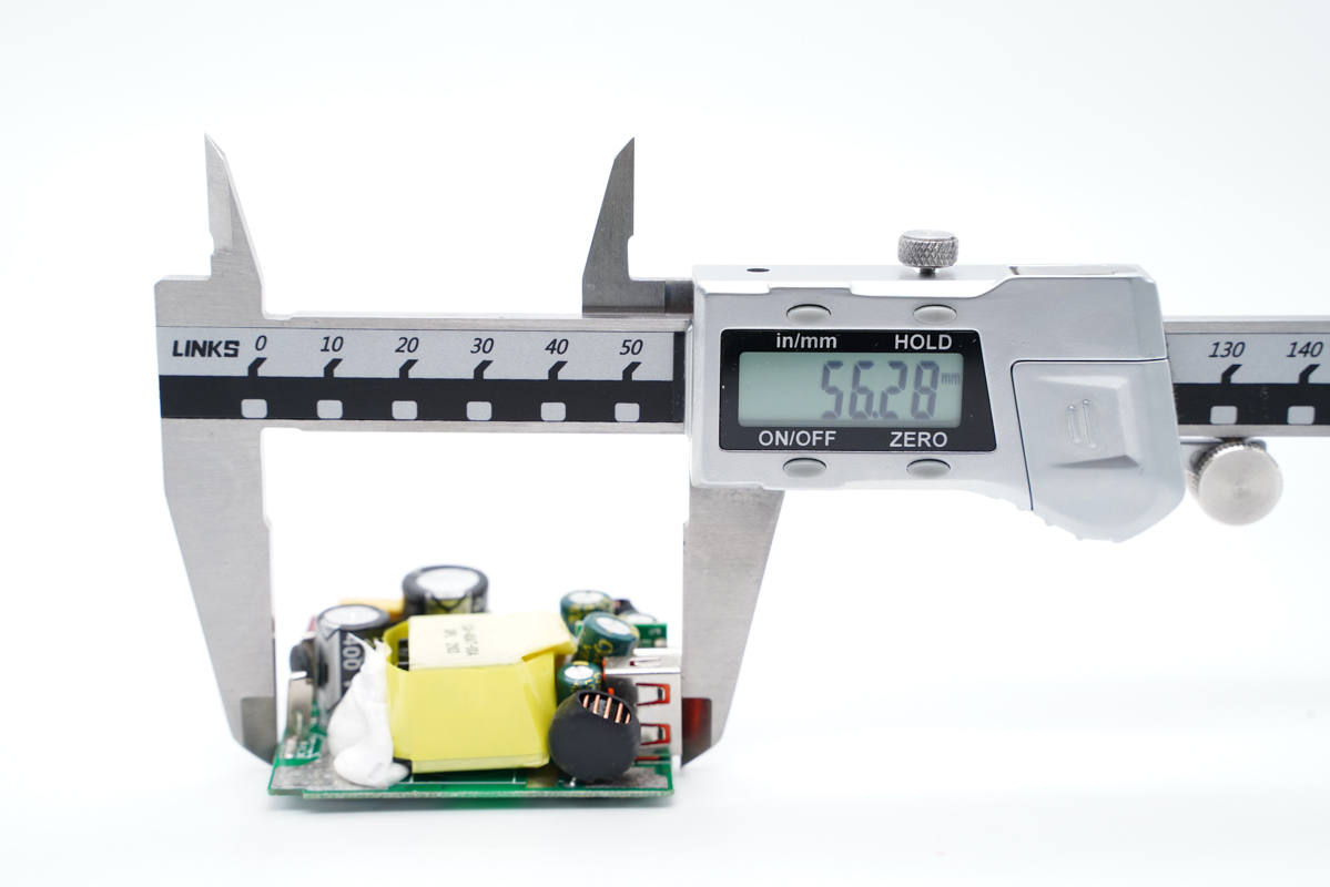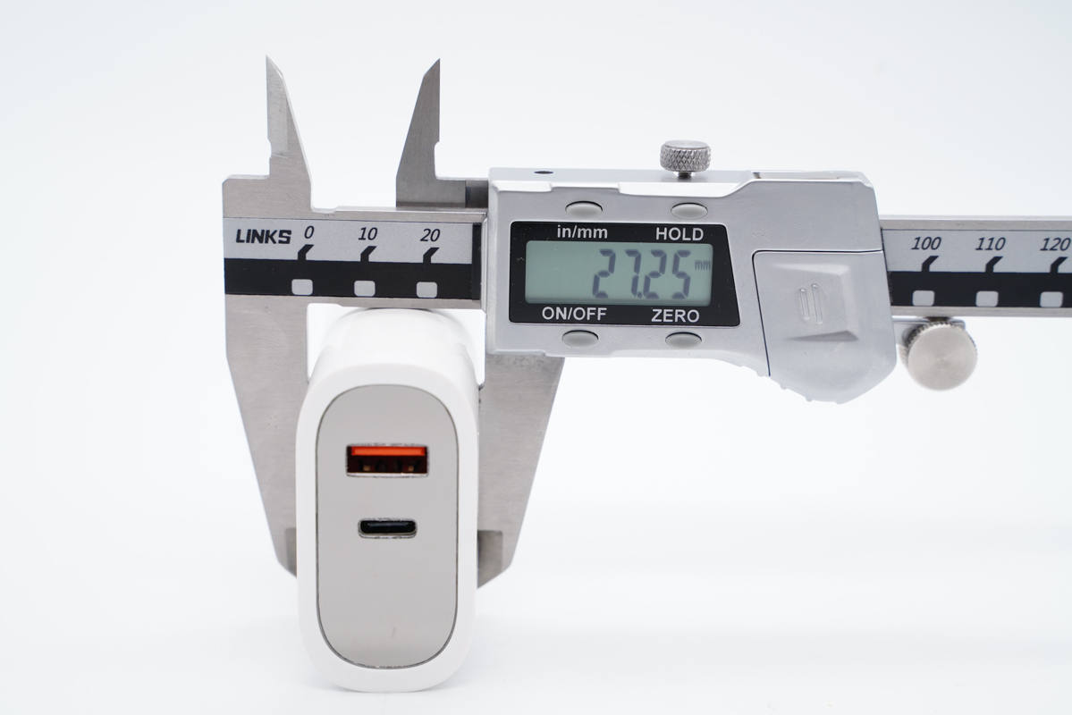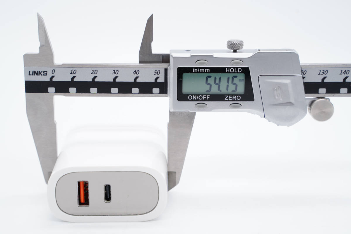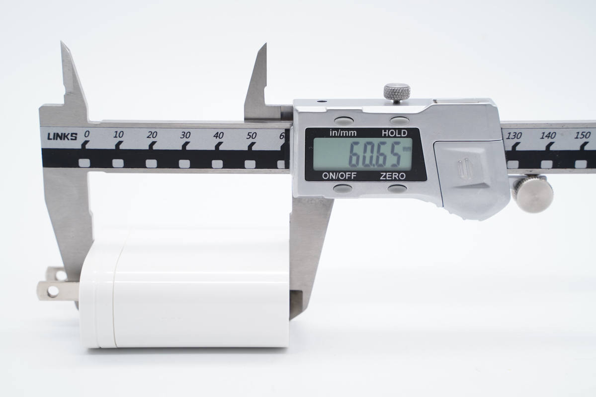 以美规充电器为例,使用游标卡尺测得充电器机身长度为60.65mm。