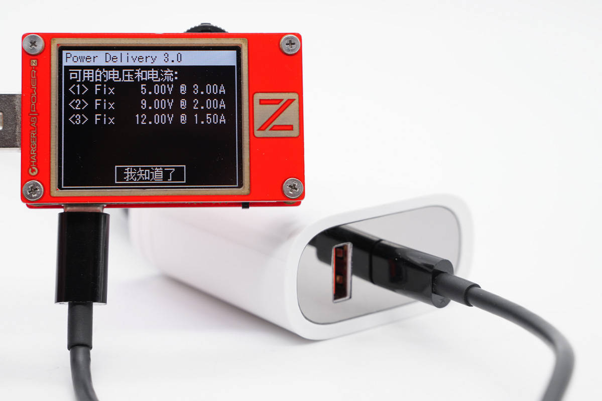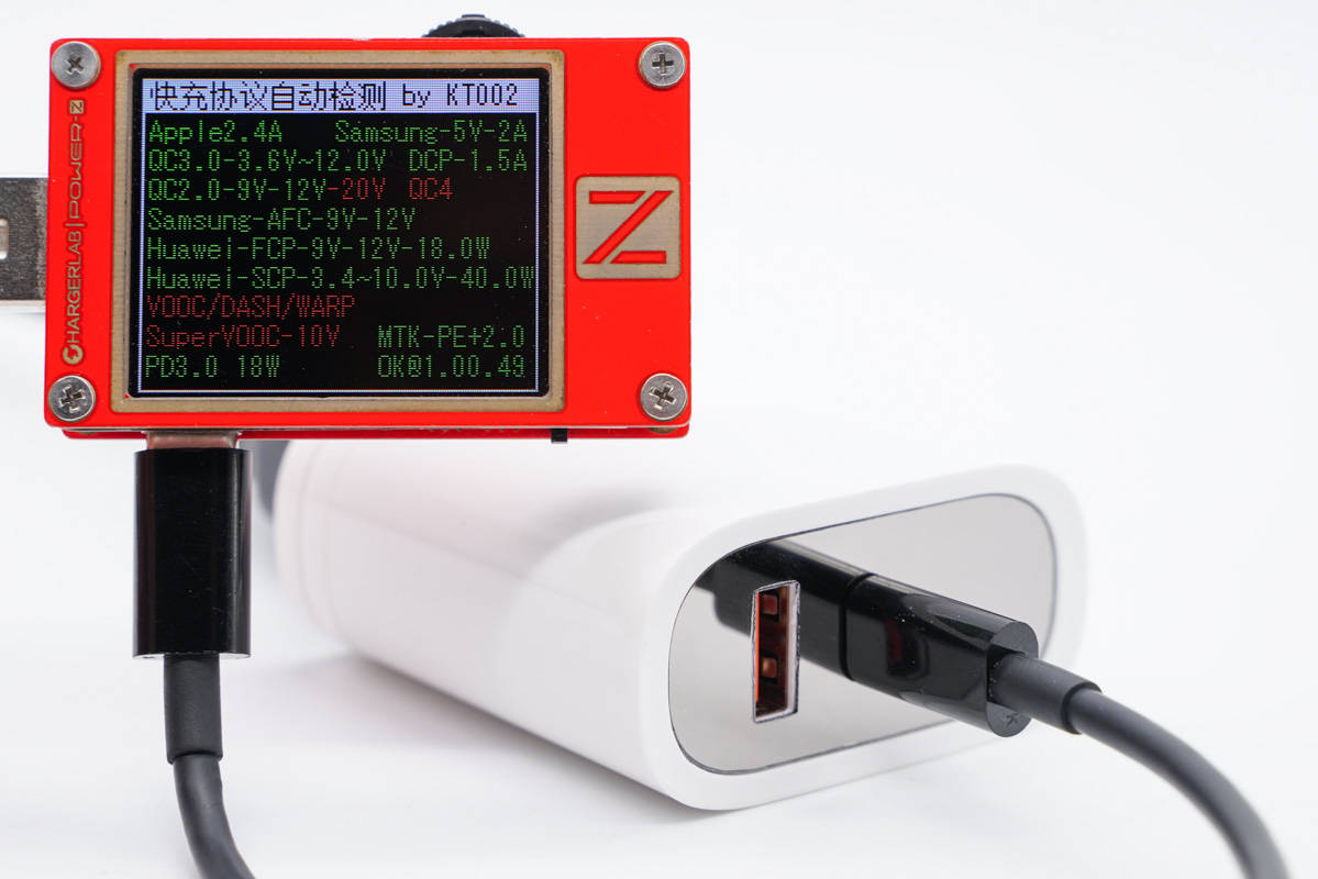 使用ChargerLAB POWER-Z KT002测得USB-A口支持Apple 2.4A、Samsung 5V2A、DCP协议,以及QC2.0/3.0、AFC、FCP、SCP、PE2.0快充协议。