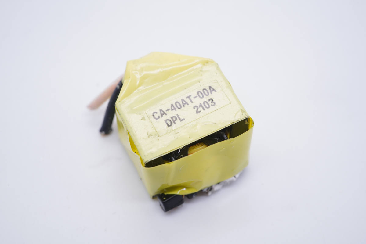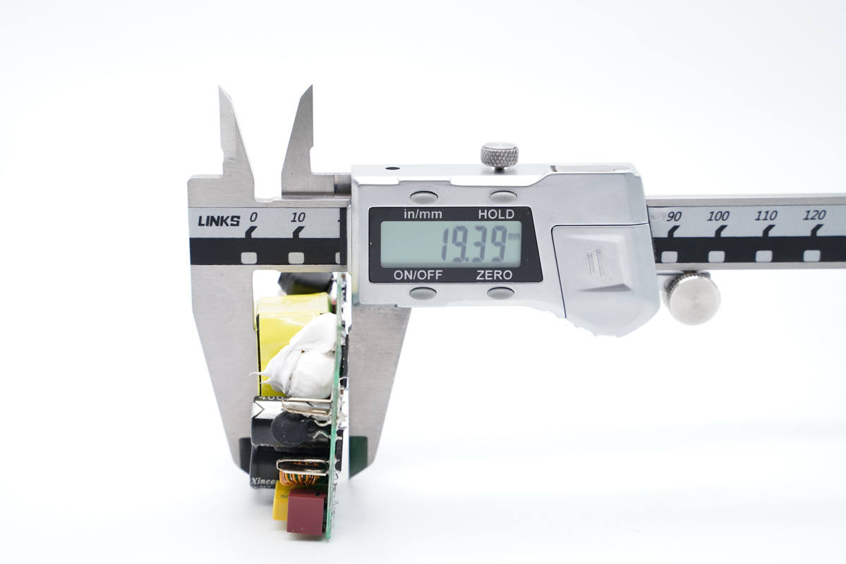 PCB板侧面一览,中间是变压器,左侧露铜加锡区域对应背面是开关电源主控芯片。