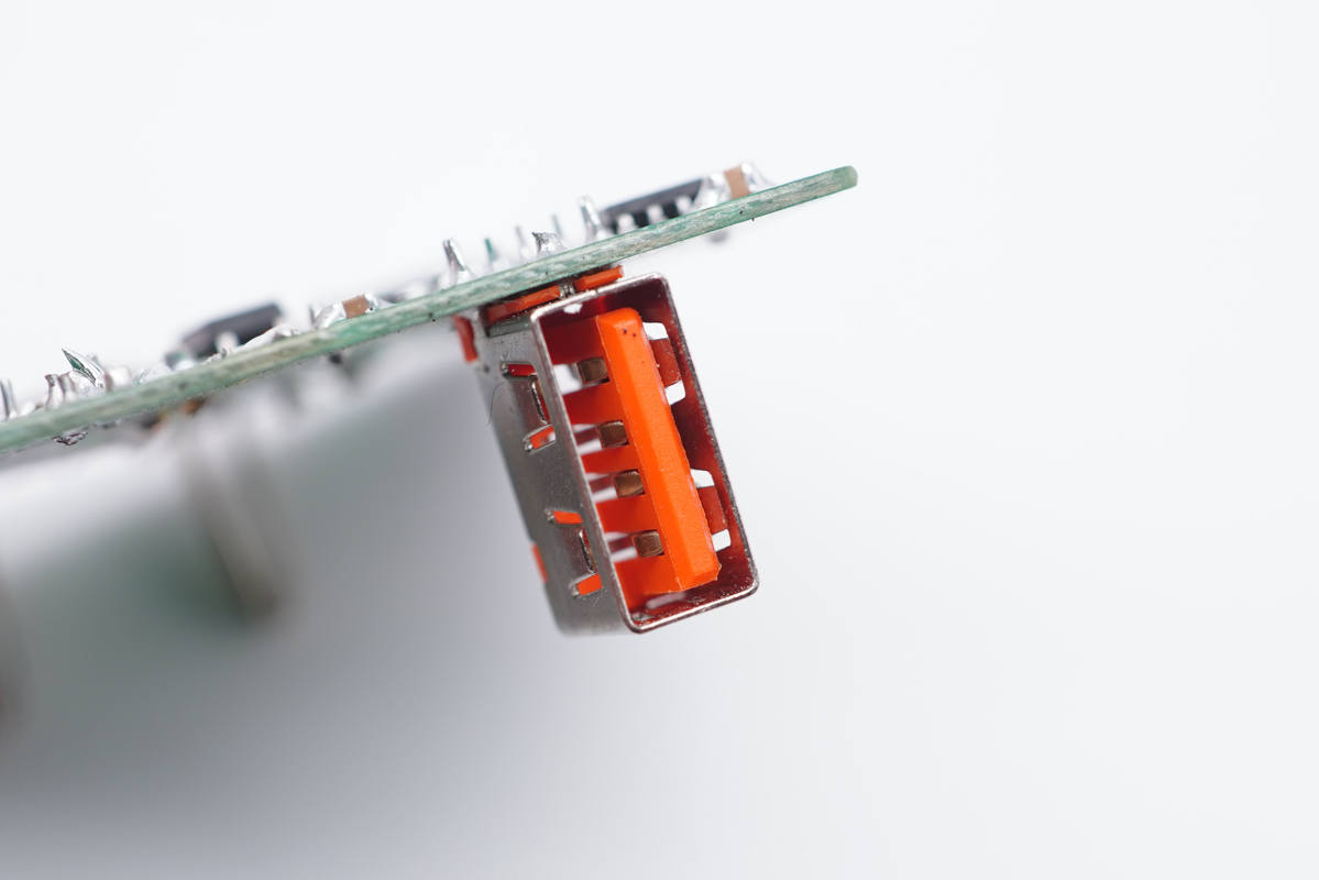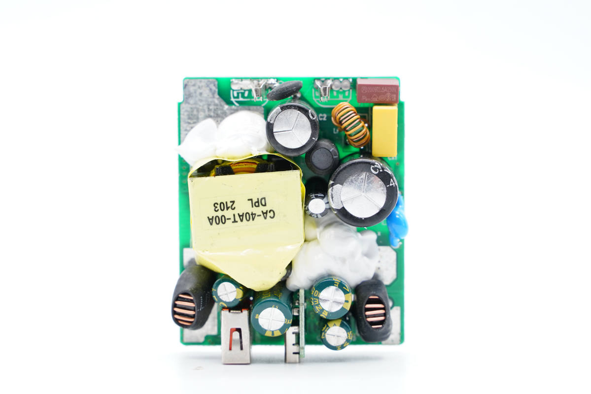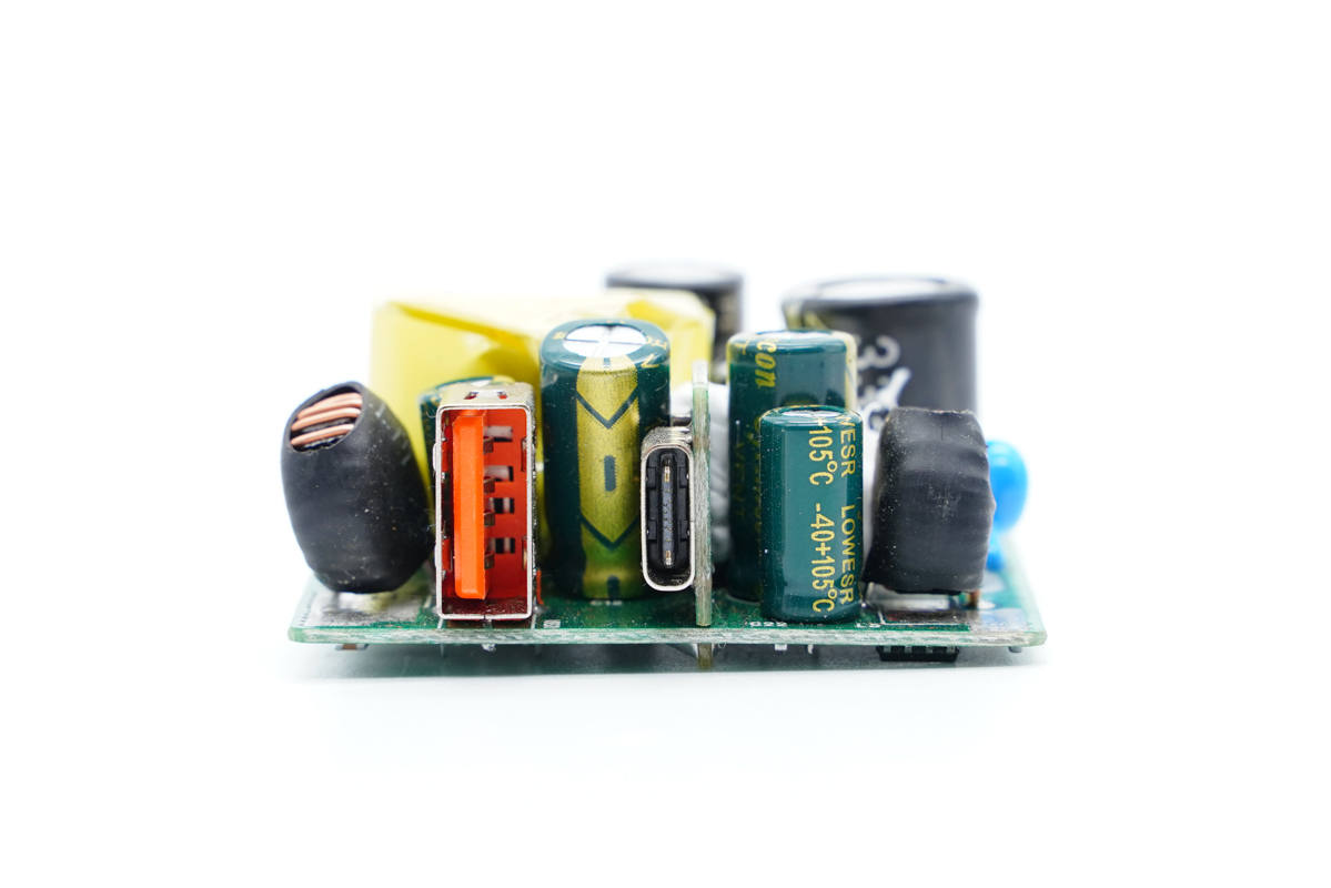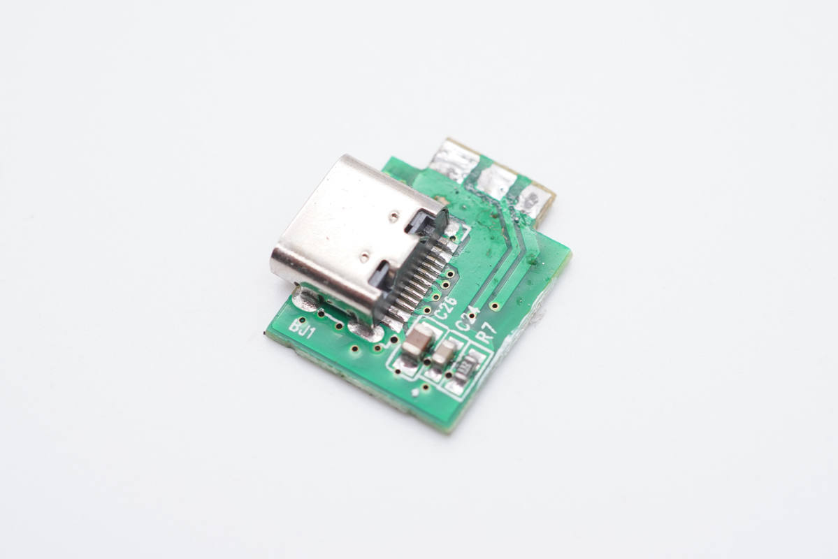 输出端一览,设有两颗降压电感和四颗滤波电容,USB-C母座使用小板垂直焊接。