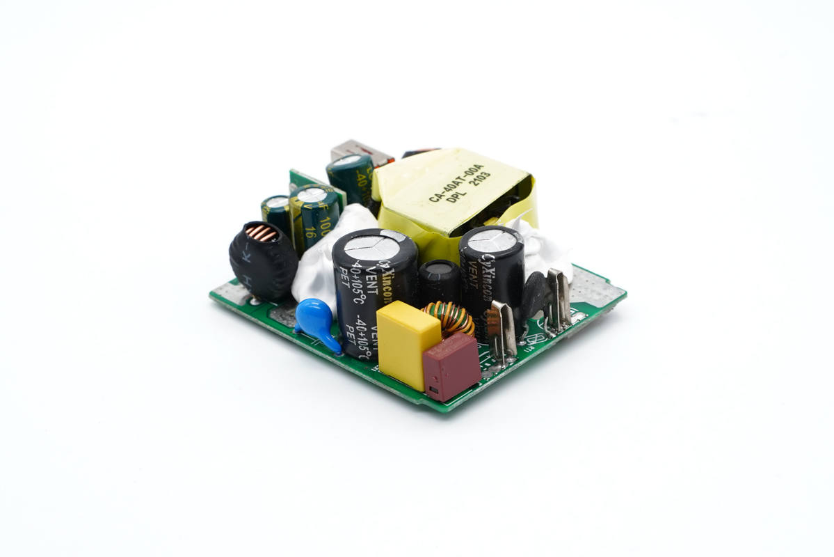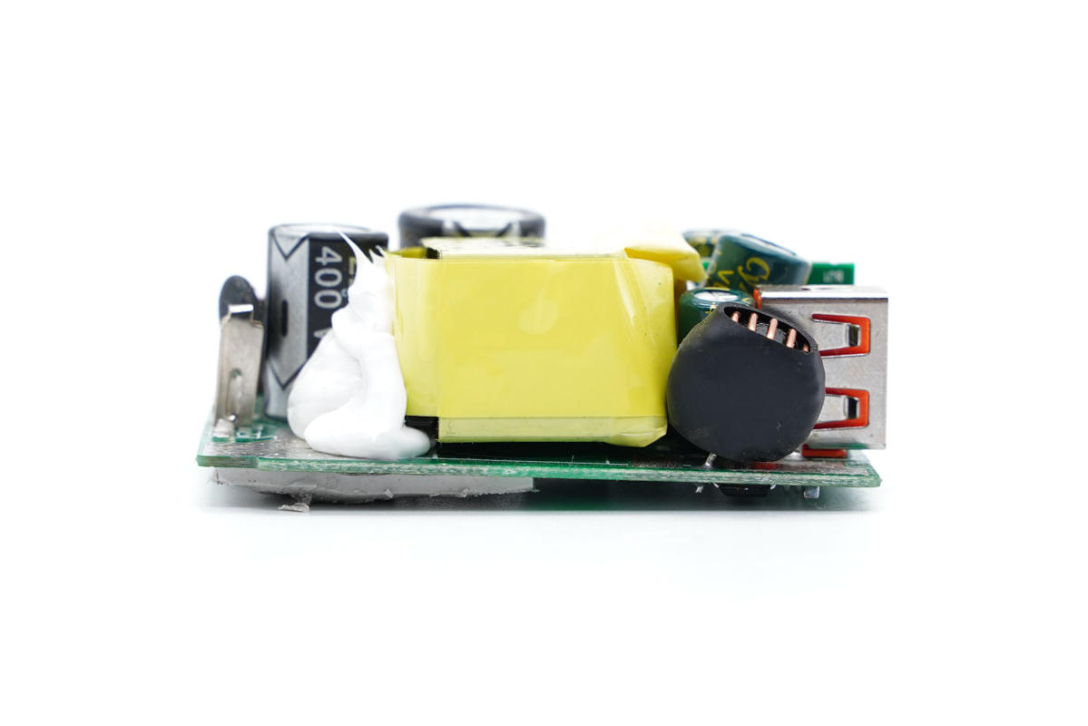 PCB板正面一览,变压器打胶加固,右上角设有保险丝、共模电感、高压滤波电容等器件,左上角以及输出端两颗电感旁边区域露铜加锡,帮助背面的芯片进行散热。