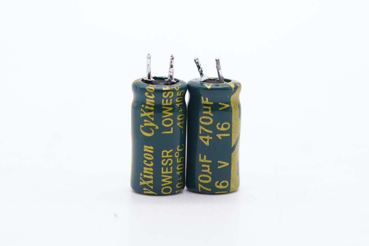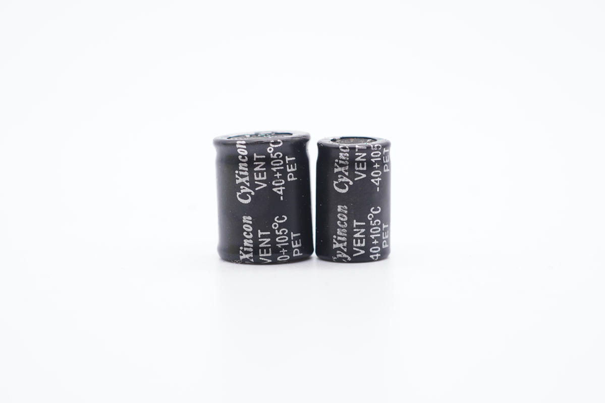 两个USB接口还各配有一颗电容进行降压输出滤波,电容规格均为16V 470μF,CyXincon品牌。