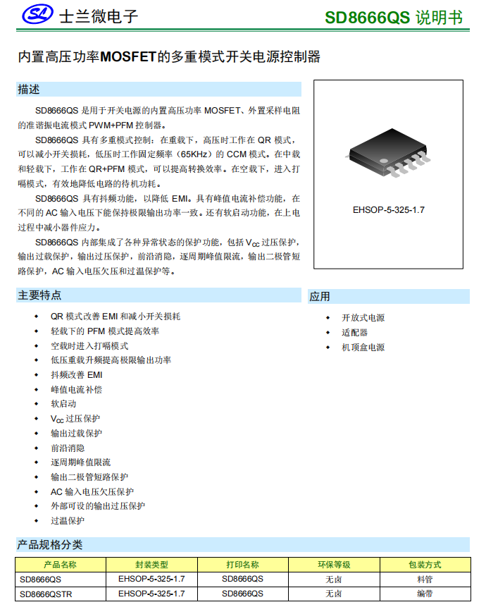 开关电源主控芯片采用士兰微SD8666QS。这是一款用于开关电源的内置高压功率MOSFET、外置采样电阻的准谐振电流模式PWM+PFM控制器。其支持多重模式控制,可有效减小开关损耗、提高转换效率和降低待机功耗;支持抖频功能;支持支持多重保护功能。
