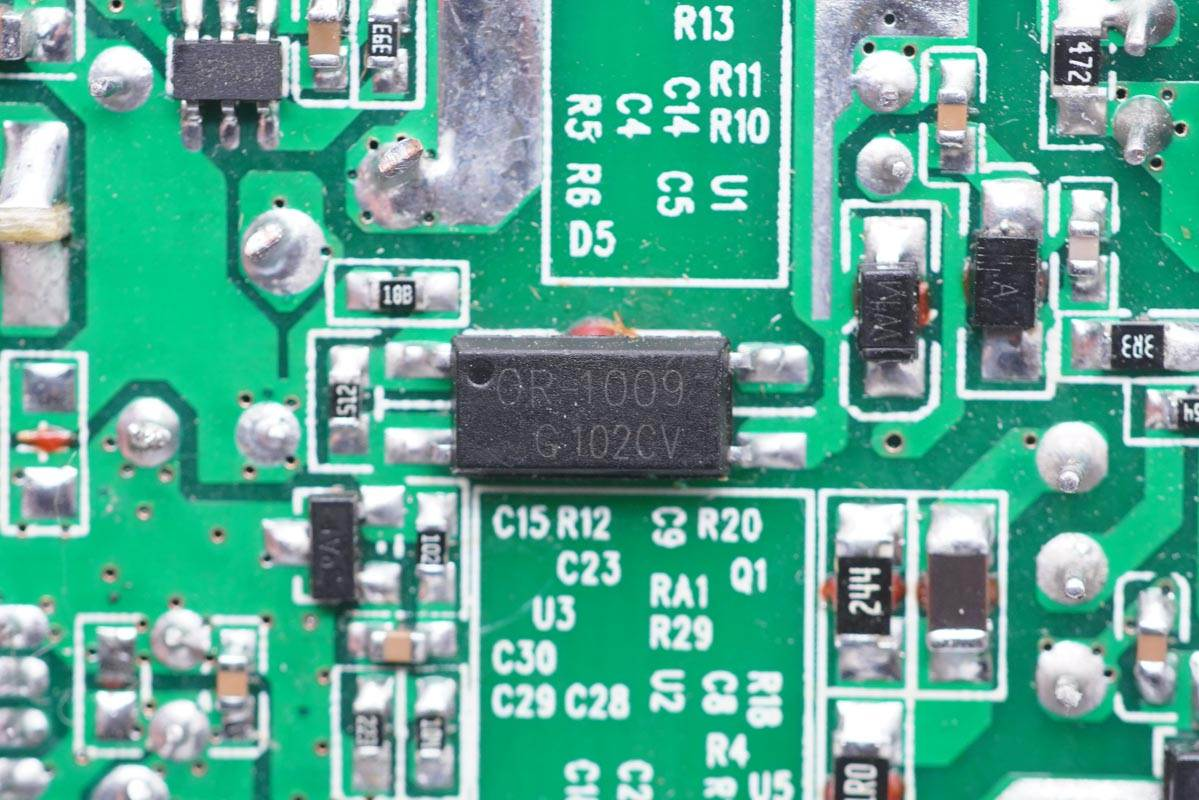 导热垫下面是开关电源主控芯片,一颗光耦横跨初次级,分界明显。