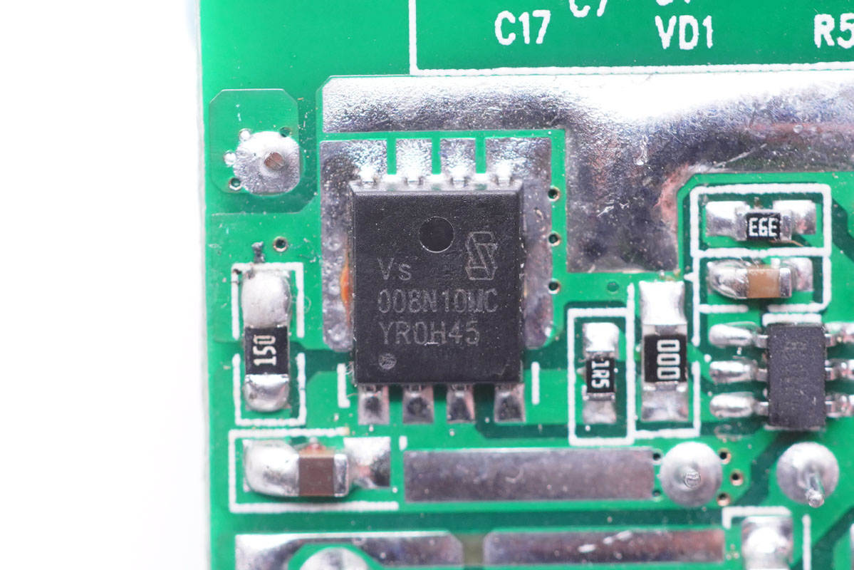 充电头网通过拆解了解到,充电器开关电源采用了士兰微SD8666QS主控,威兆VSP008N10MSC同步整流管组成。采用英集芯IP6520和IP6505分别用于C口和A口二次降压和协议识别,控制这两个接口输出电压。另外主板正面对应主控芯片和协议芯片处均作了露铜加锡设计,主控芯片上还贴有导热垫,厚实为了帮助散热,细节讲究。