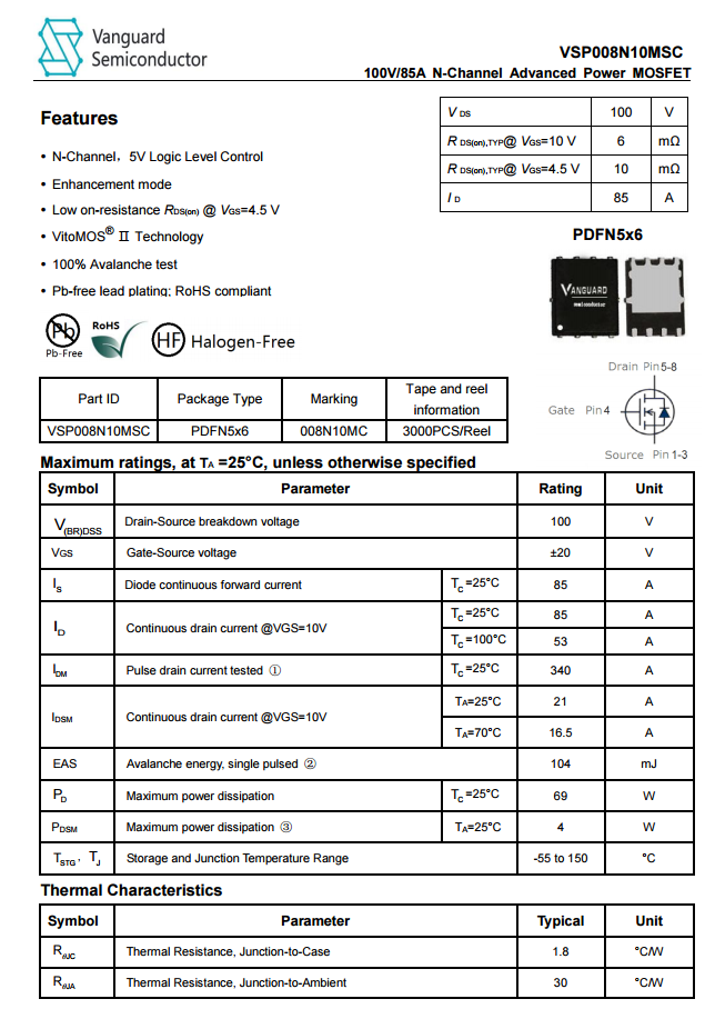 同步整流管采用威兆半导体VSP008N10MSC,NMOS管,耐压100V,PDFN5x6封装。