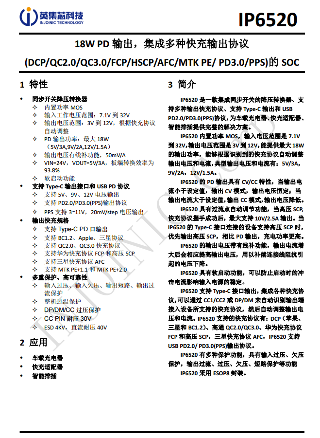 IP6505内置MOS管,最大输出电流3A,转换效率最高97.5%,并具有输入过压、欠压保护,输出过流、过压、欠压、短路保护等功能。IP6520支持的快充协议包括:DCP(苹果、三星、BC1.2)、高通QC2.0/QC3.0、MTK PE1.1/2.0、华为FCP,三星AFC以及展讯SFCP等。