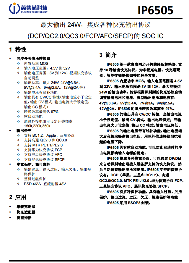 USB-A口协议芯片采用英集芯IP6505,用于A口二次降压和协议识别。IP6505是一款集成同步开关的降压转换器,支持10种输出快充协议,为车载充电器、快充适配器、智能排插提供完整的解决方案。