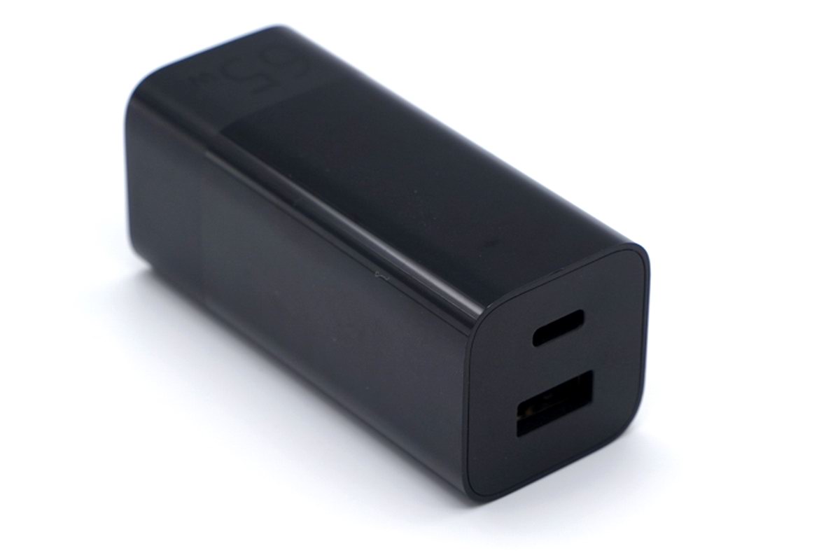 紫米 65W 1A1C氮化镓充电器采用目前最为主流的条形柱状外观设计,1A1C 双口配置,主体采用黑色外观设计,风格较为沉稳商务。