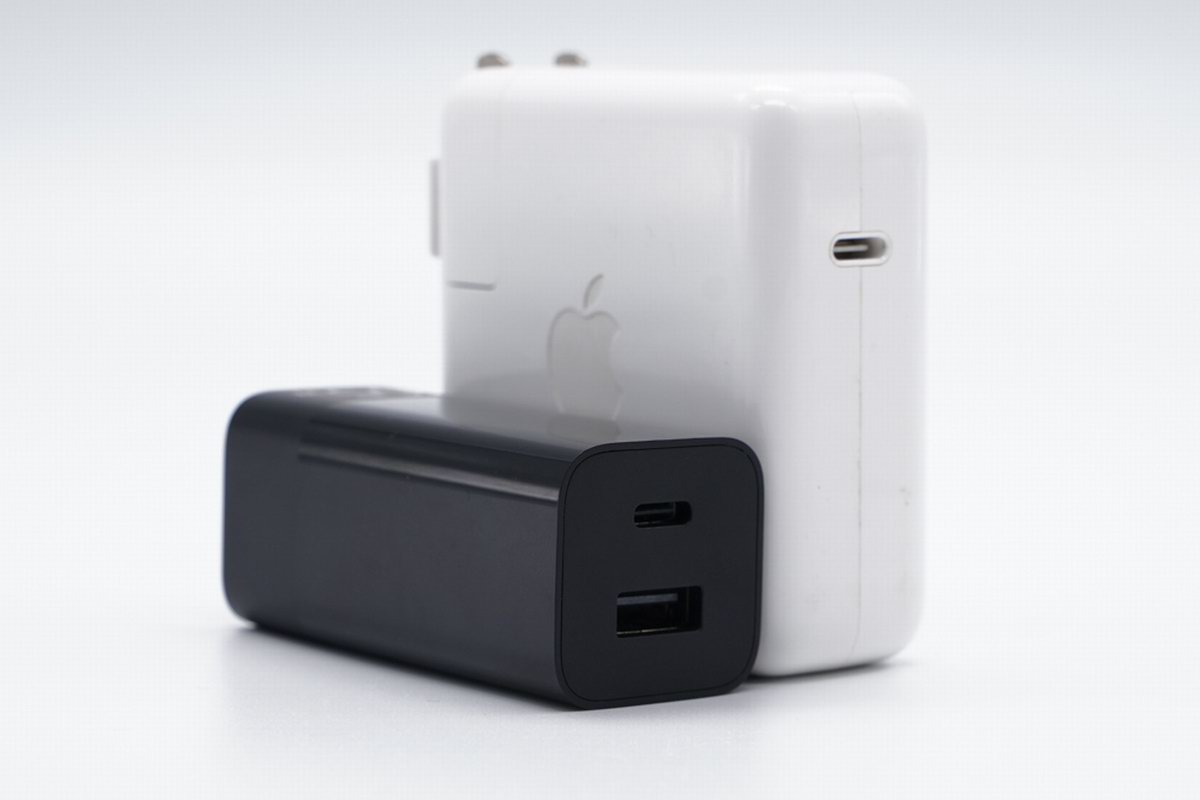 虽然并未测量准确的三围尺寸,但将紫米 65W 1A1C氮化镓充电器与苹果61W充电器放在一起可以看出,紫米体积十分的娇小,功率密度数据应该十分漂亮。并且紫米 65W 1A1C氮化镓充电器还支持1A1C双口输出,兼容性更好,也支持多设备同时充电。