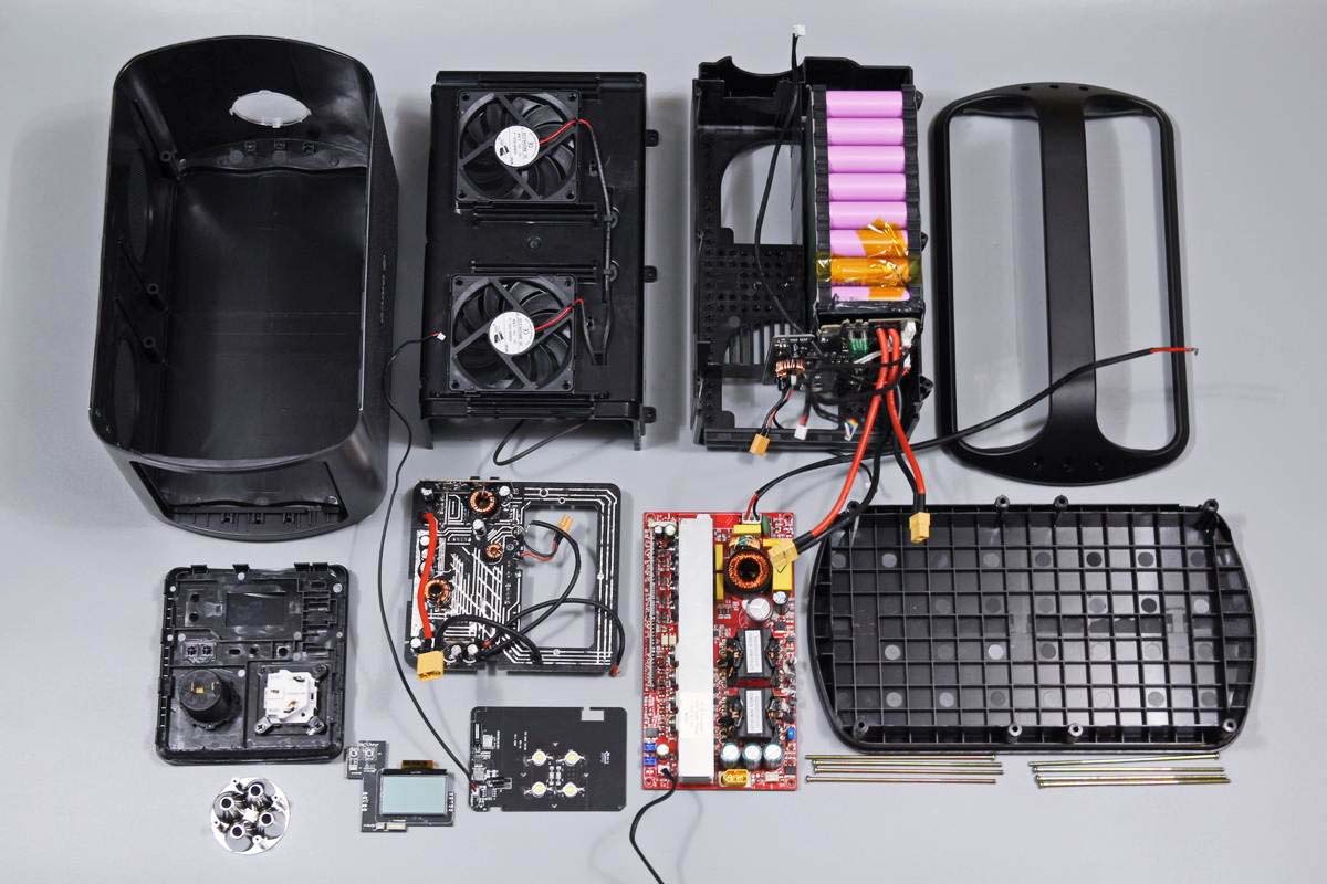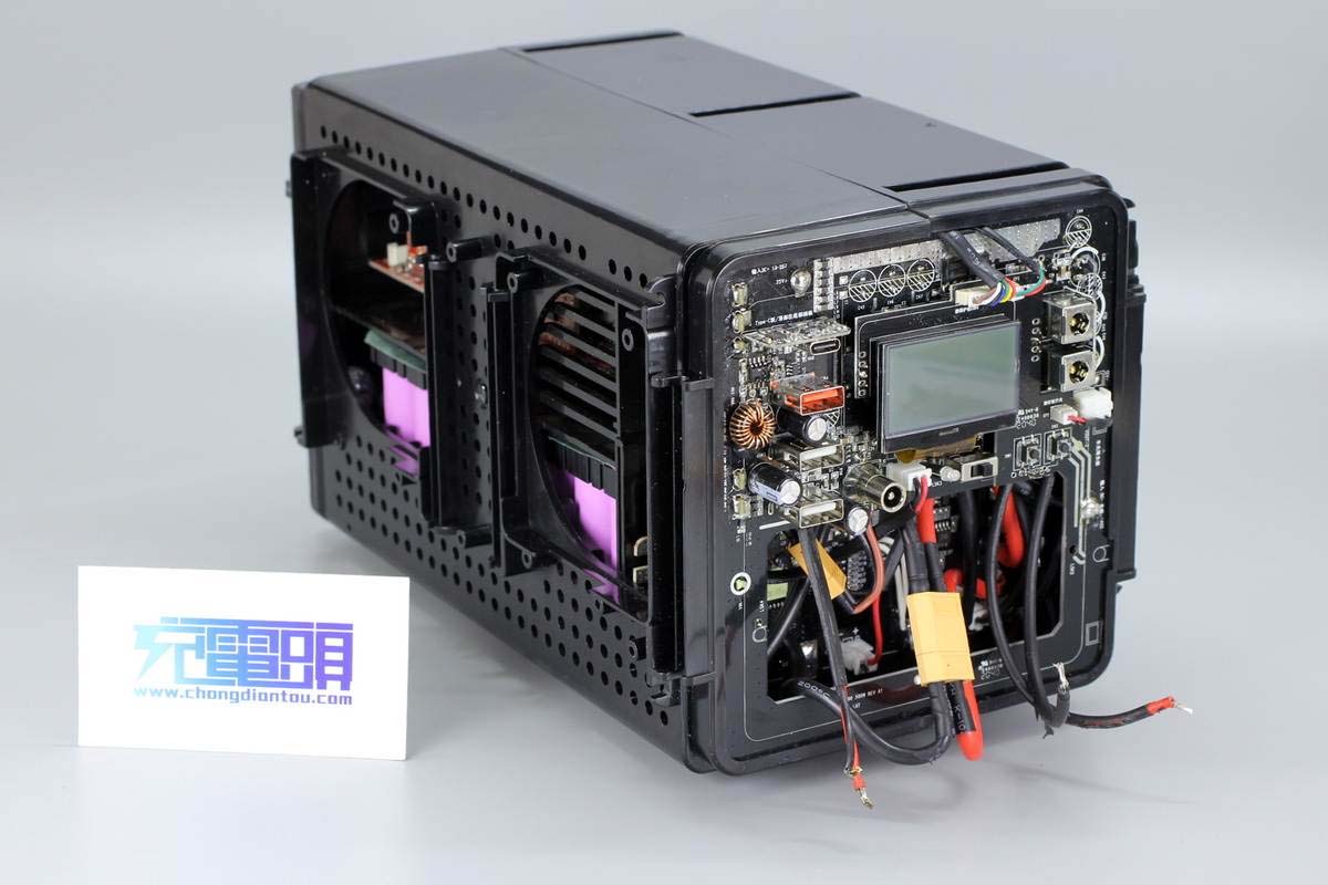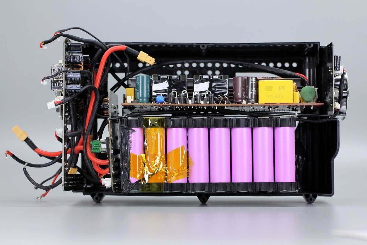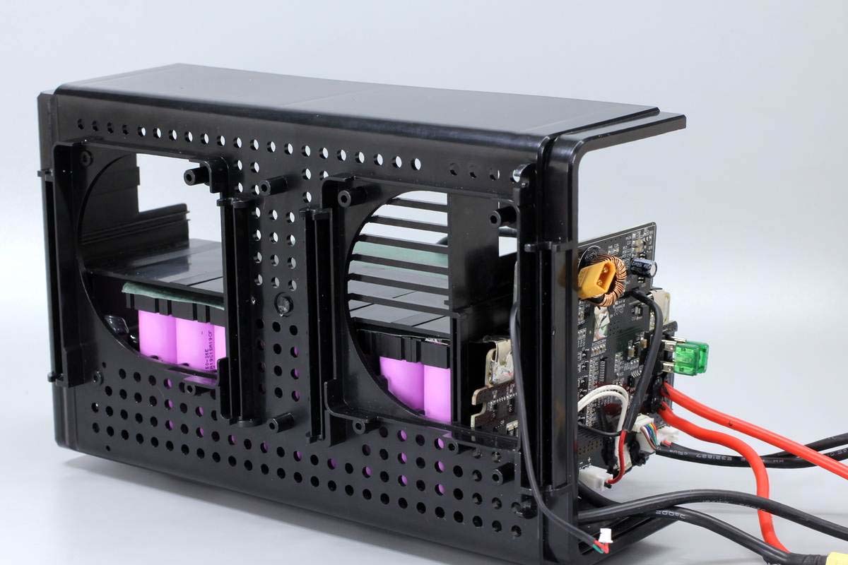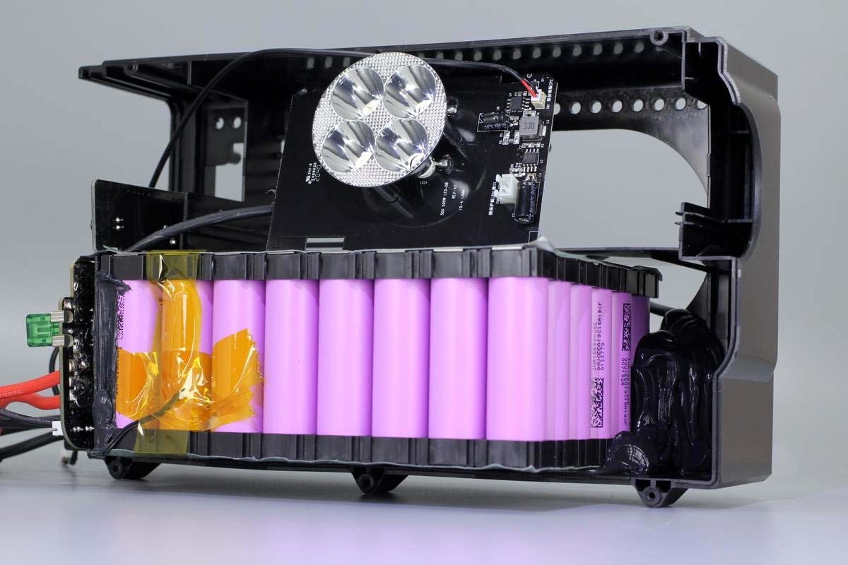 电池组上下均有塑料板固定保护,左侧设有接口功能模块电路板以及中间的电池保护电路板,顶部是逆变器电路板,右侧是照明灯电路板。