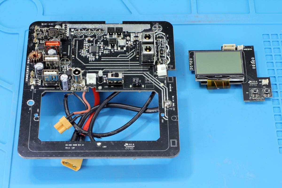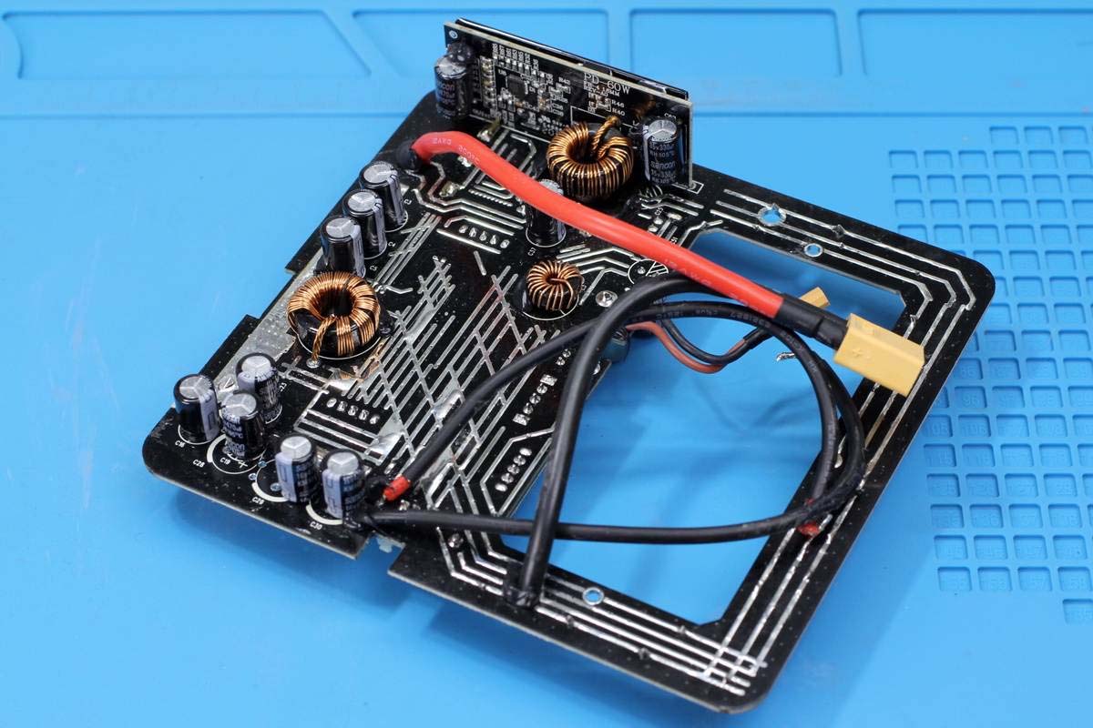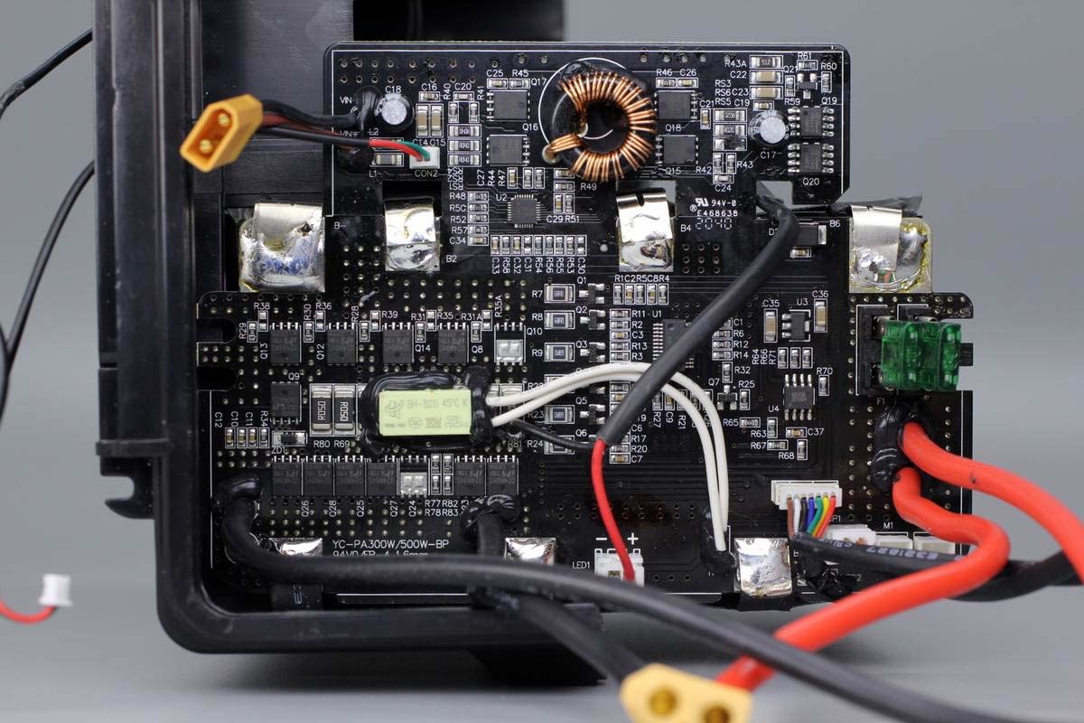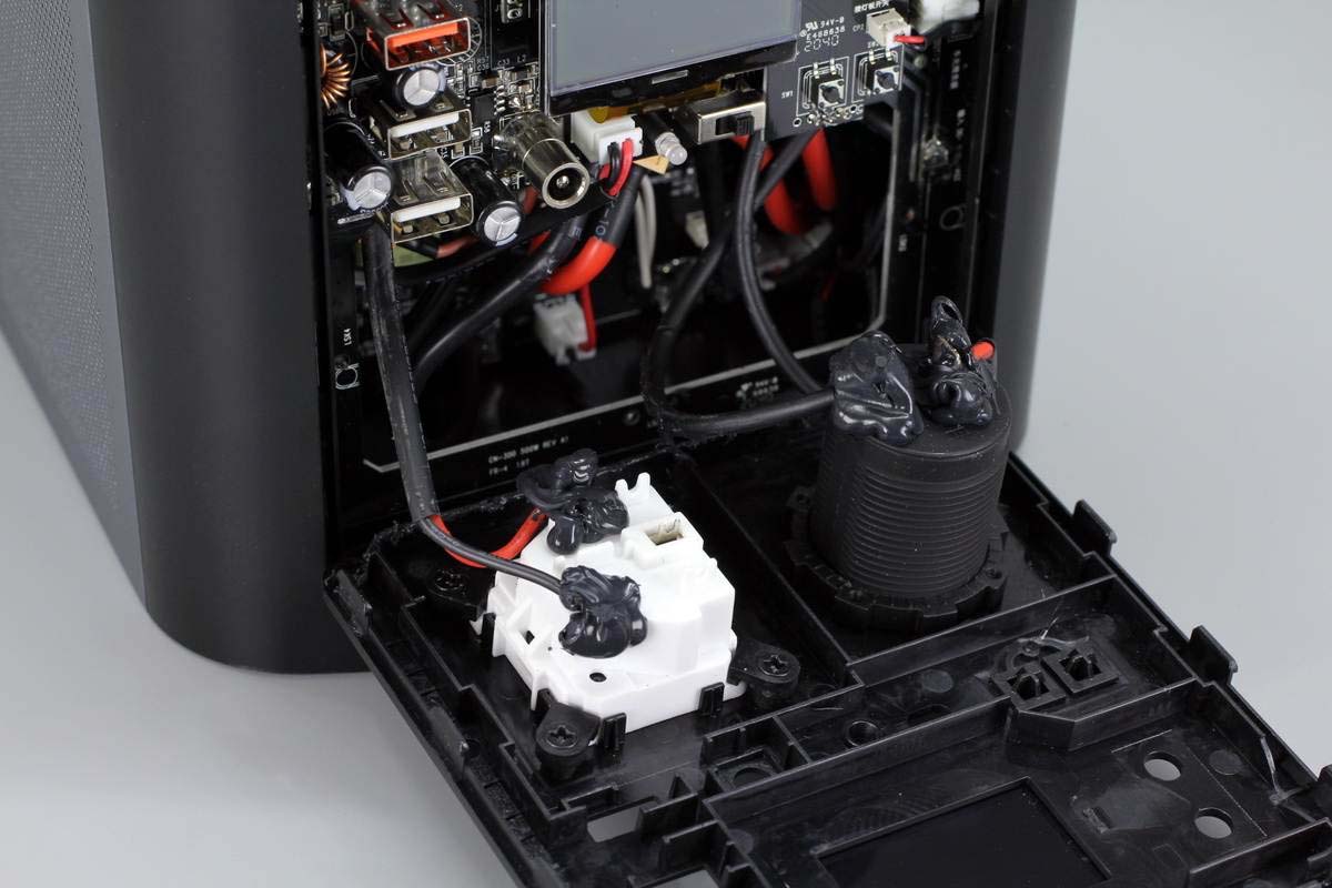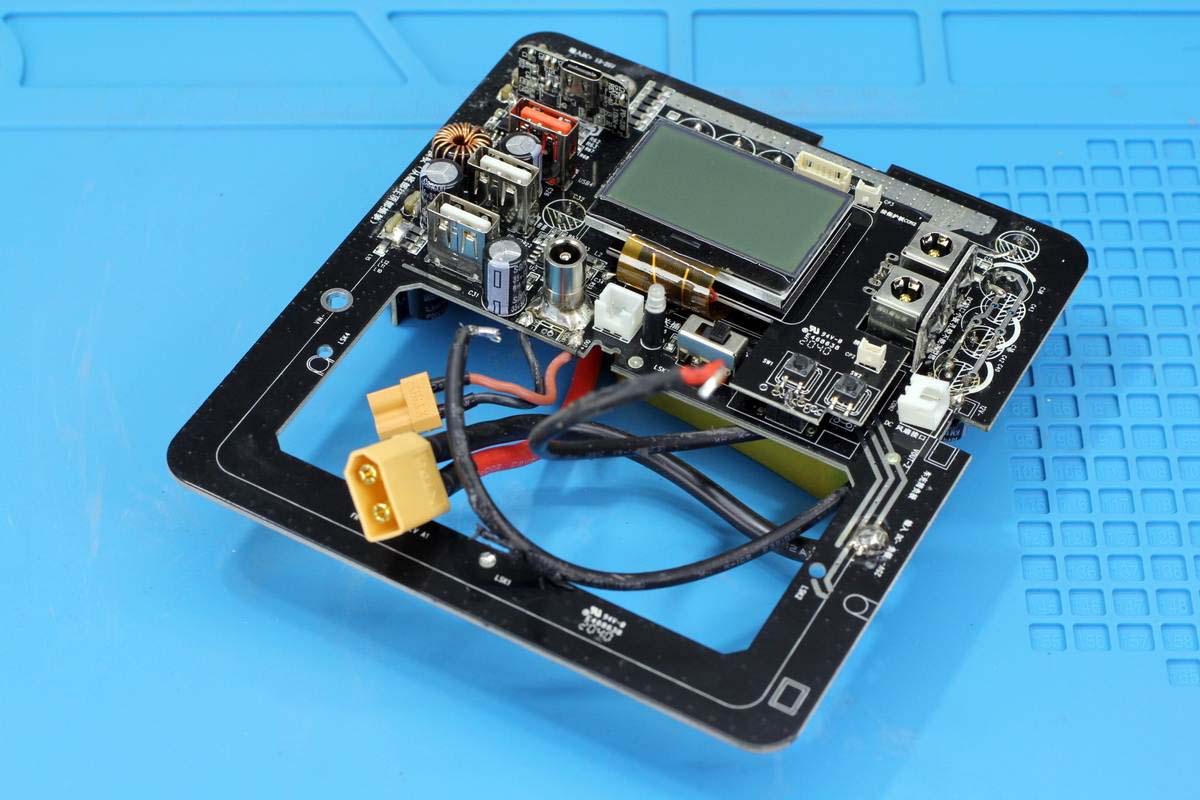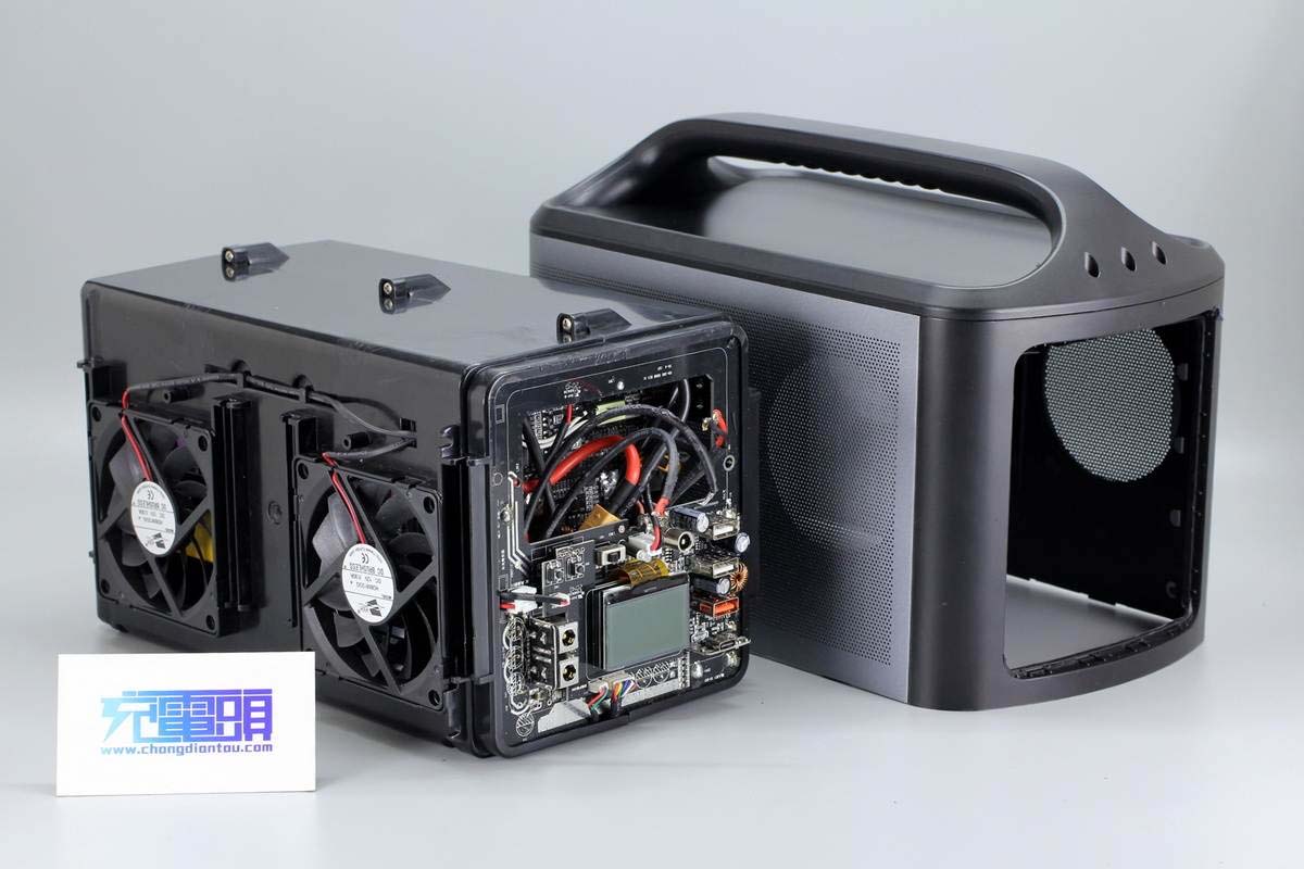 电池组上下均有塑料板固定保护,左侧设有接口功能模块电路板以及中间的电池保护电路板,顶部是逆变器电路板,右侧是照明灯电路板。
