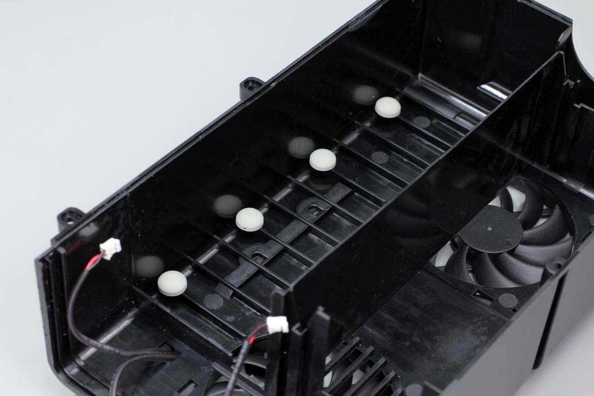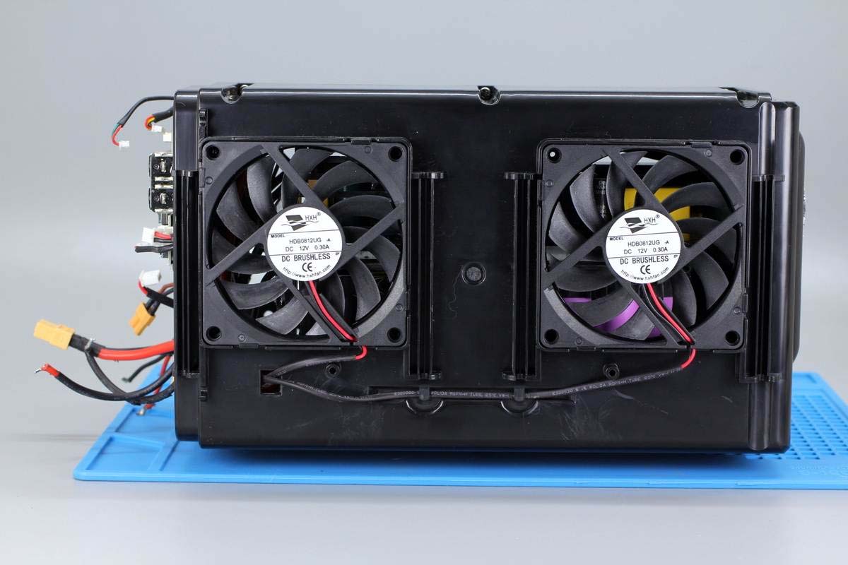 风扇的导线线头插拔式设计,方便组装。塑料壳上贴有四个白色圆垫,用以保护电芯。