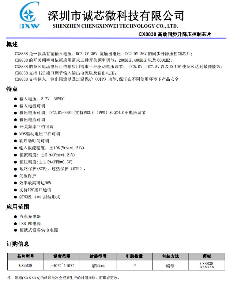 诚芯微CX8838高效同步升降压控制器,用于DC输入升降压为电池充电。CX8838支持2.7V-36V宽输入电压以及2.0V-36V宽输出电压;其开关频率可依据应用需求三种开关频率调节:200KHZ、400KHZ以及600KHZ;其MOS驱动电压可依据应用需求三种驱动电压调节: DC5.0V、DC7.5V以及DC10V,使MOS达到最佳能效。