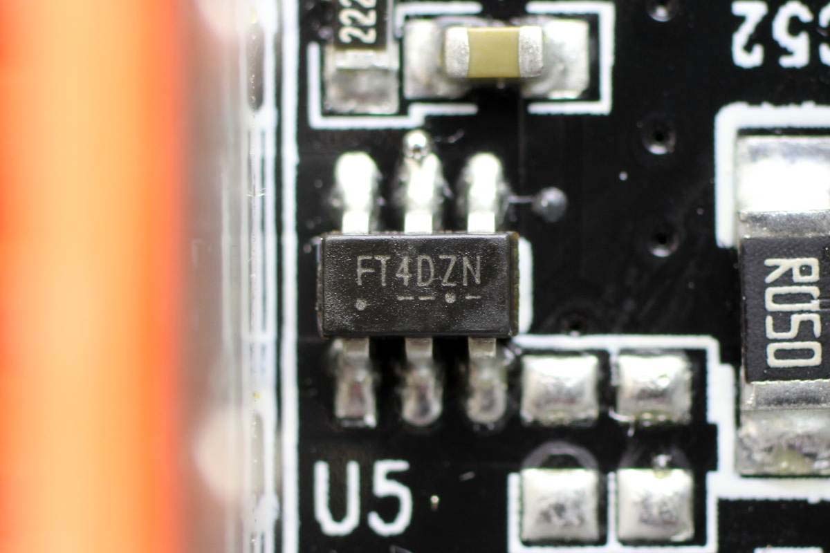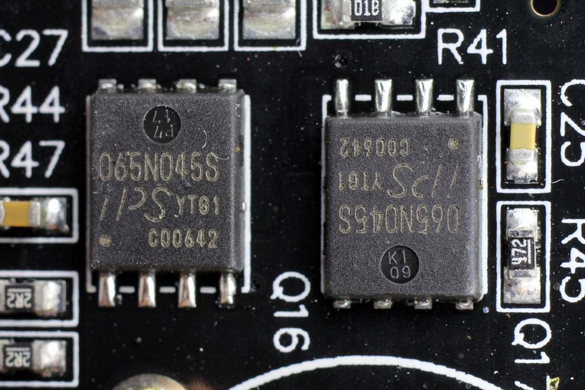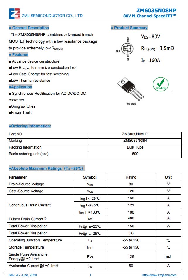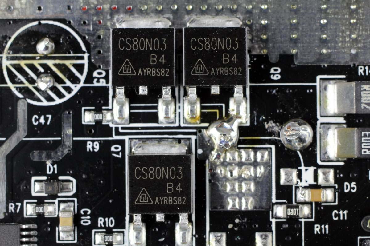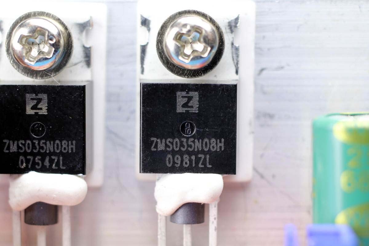 散热片左侧一共固定四颗真茂佳ZMS035N08HP MOS管,NMOS,耐压80V,导阻3.5mΩ,用于逆变升压。