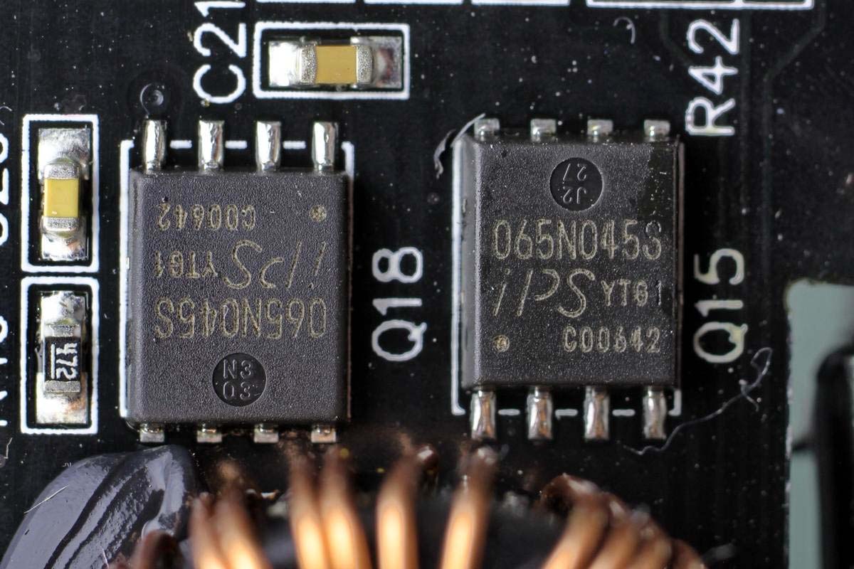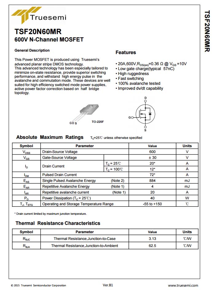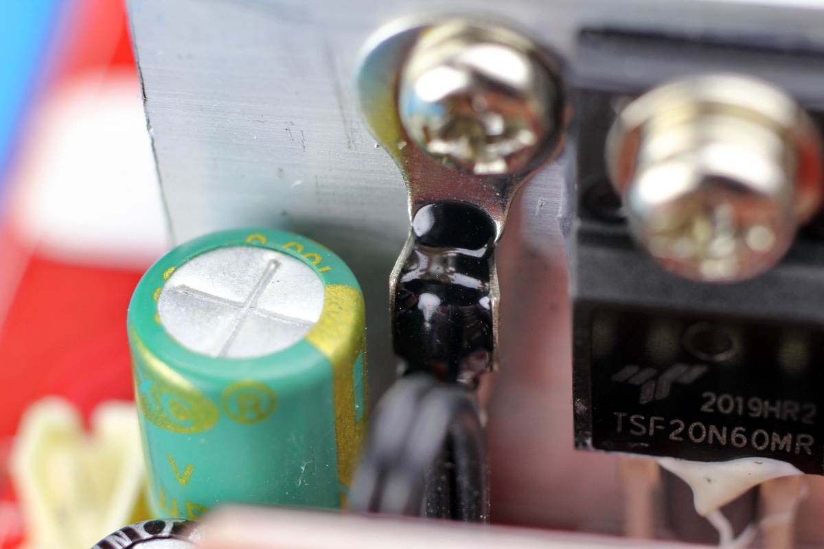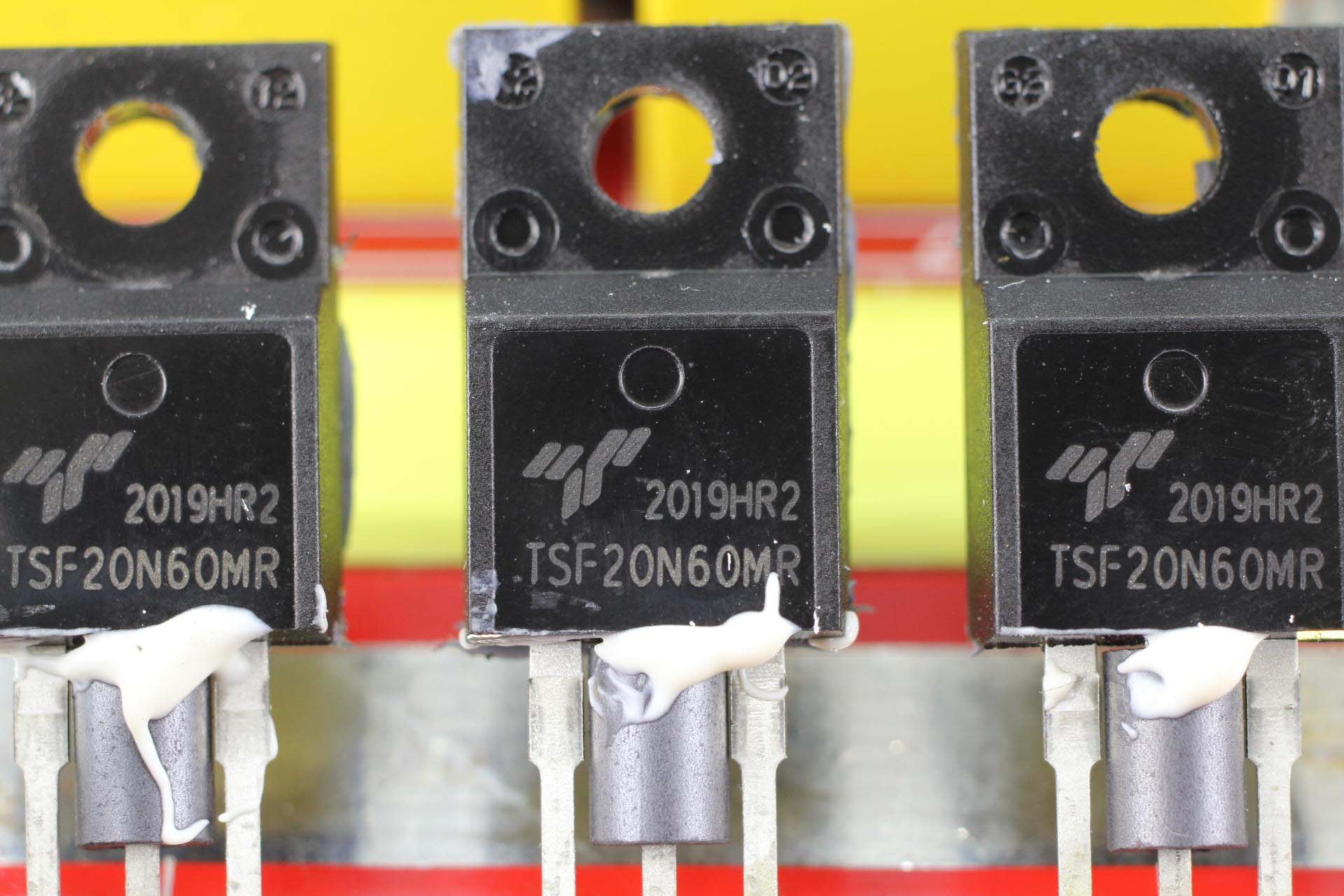 右侧固定有四颗信安TSF20N60MR MOS管,NMOS管,耐压600V,导阻0.36Ω,用于交流输出波形调制。