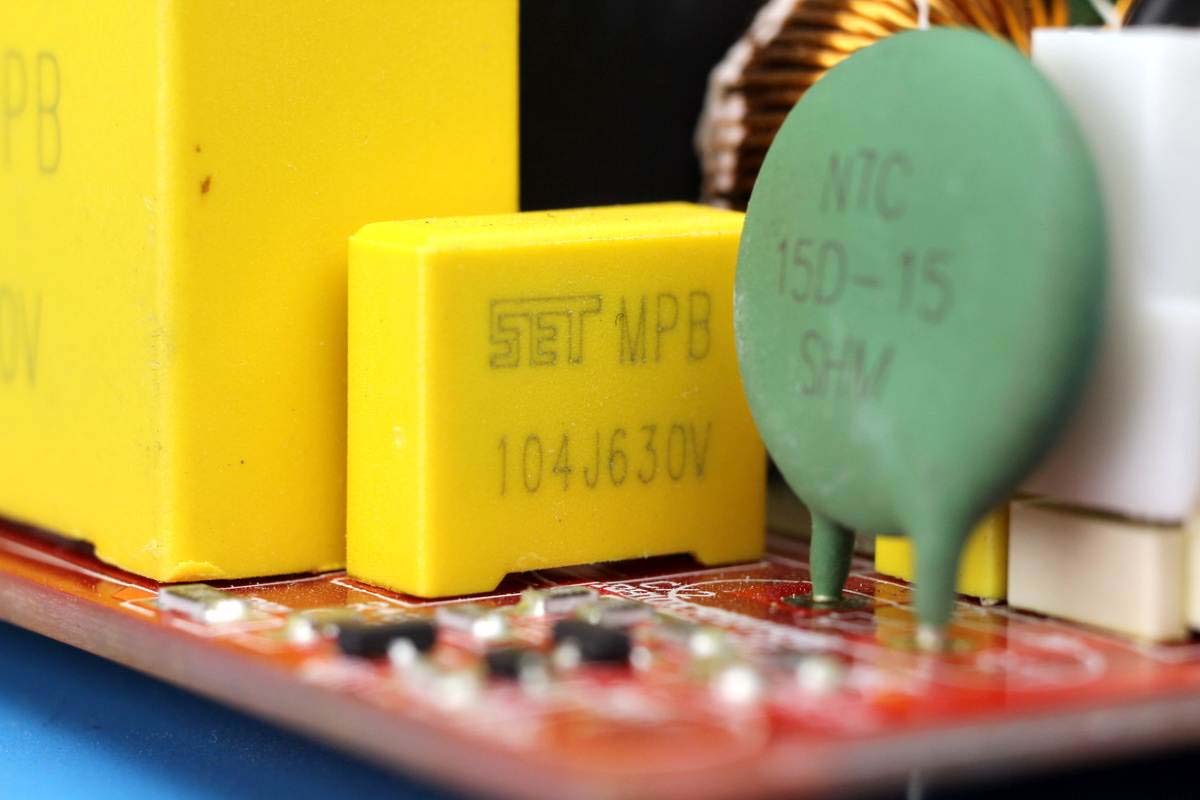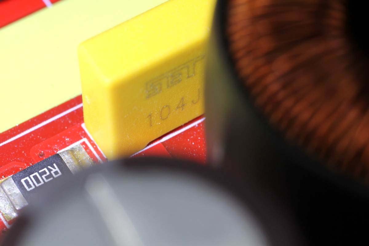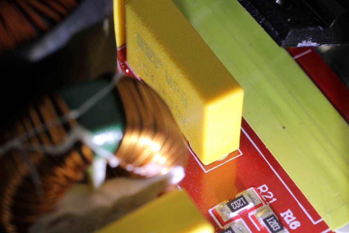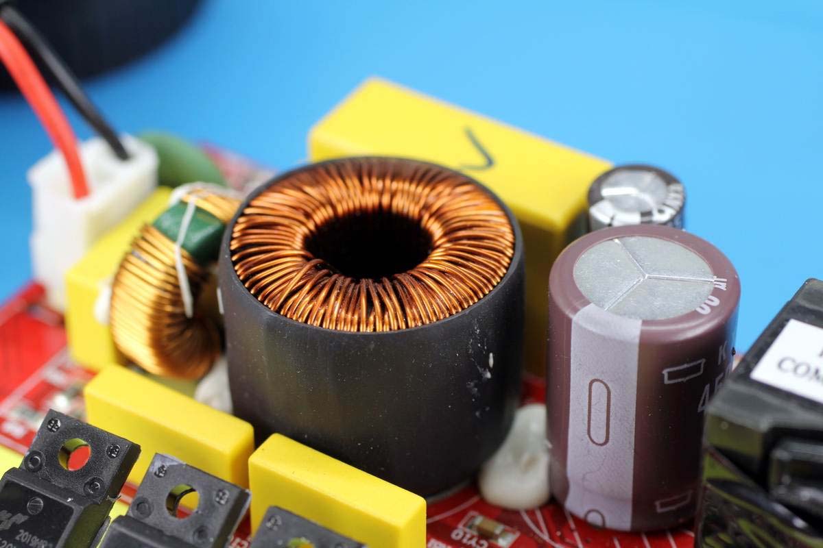 滤波电感外套绝缘管保护,周围有一颗共模电感以及多颗黄色的安规电容。