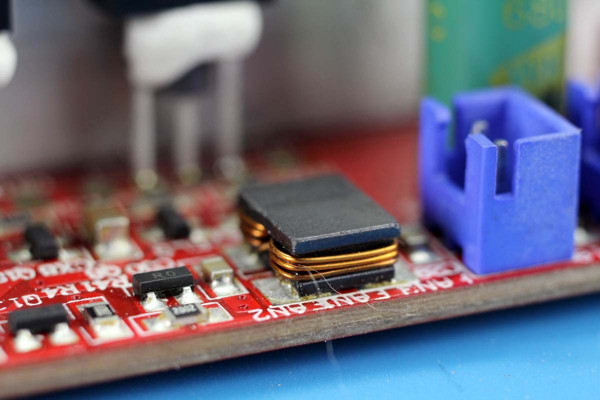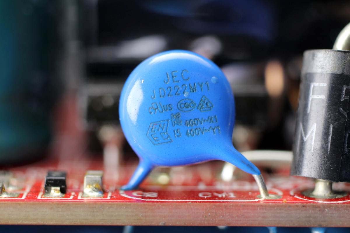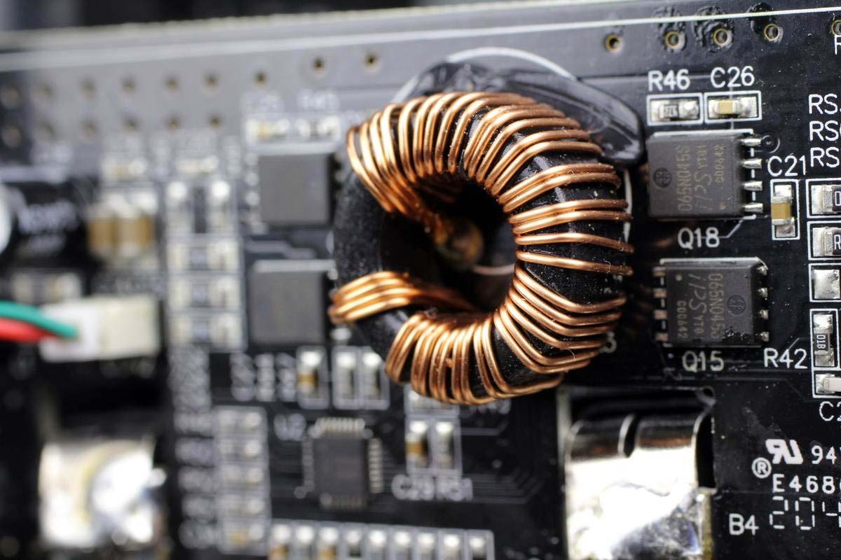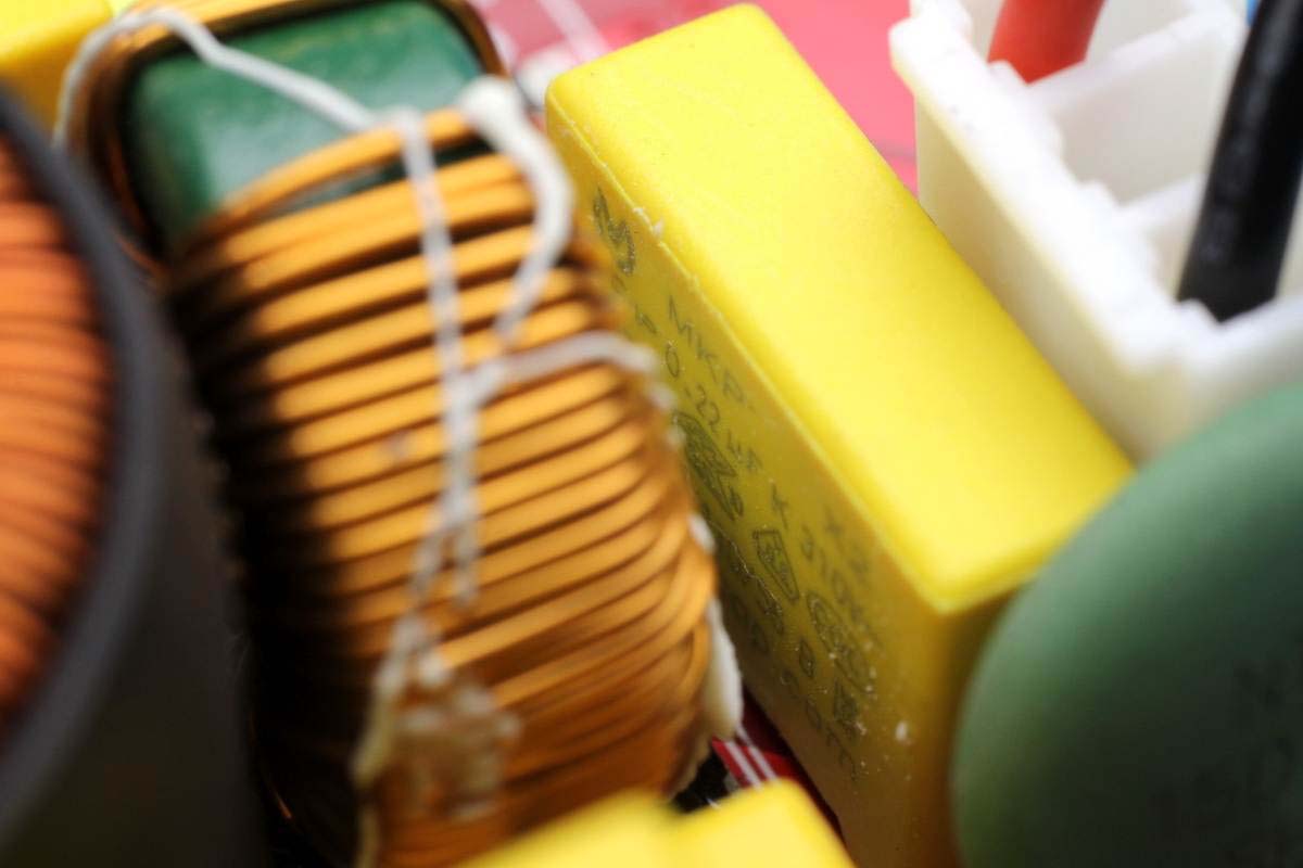 滤波电感外套绝缘管保护,周围有一颗共模电感以及多颗黄色的安规电容。