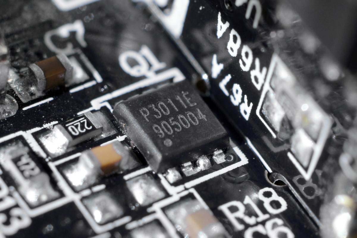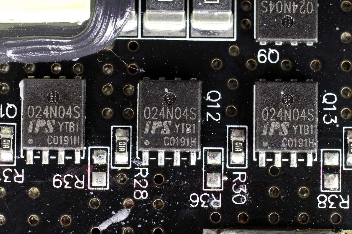 另一侧垂直焊接一块小板,散热片上固定有多颗MOS管。