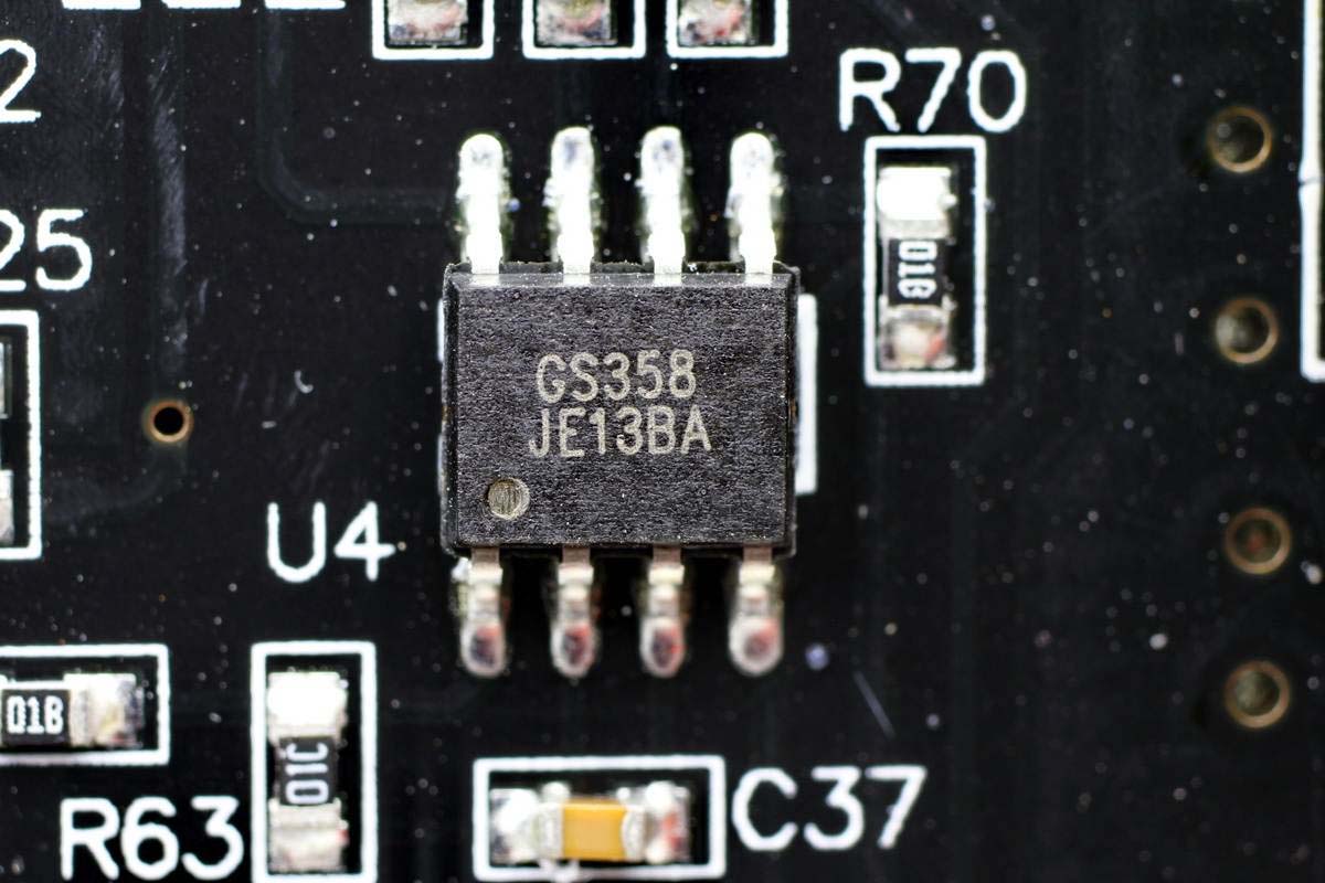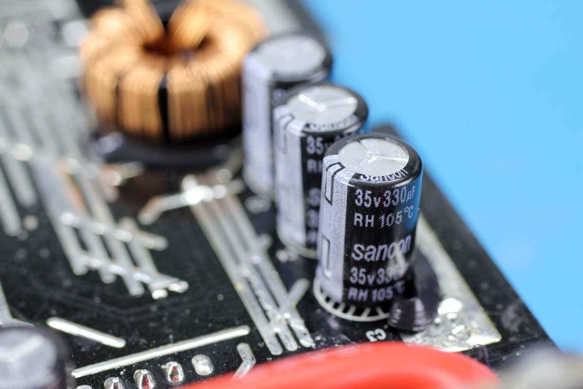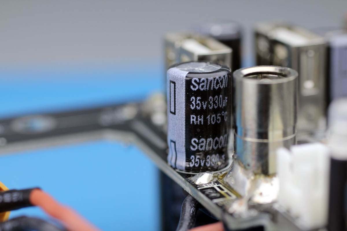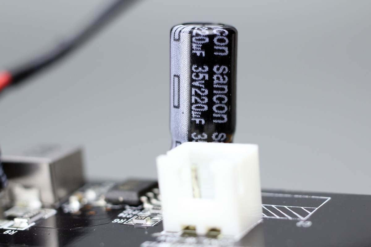 背面设有对应的滤波电容,规格为35V 330μF,三颗并联。