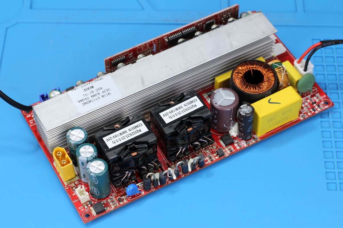 逆变器电路板中间设有散热片,这一侧设有滤波电容、变压器等器件。