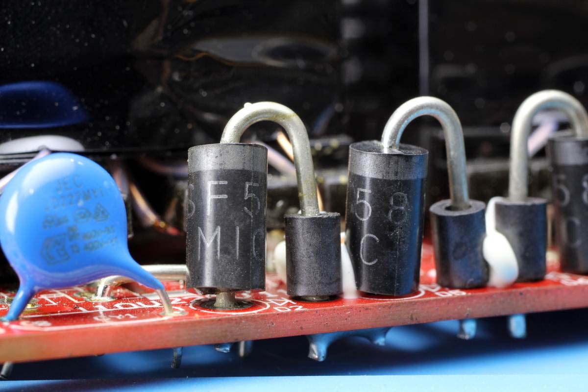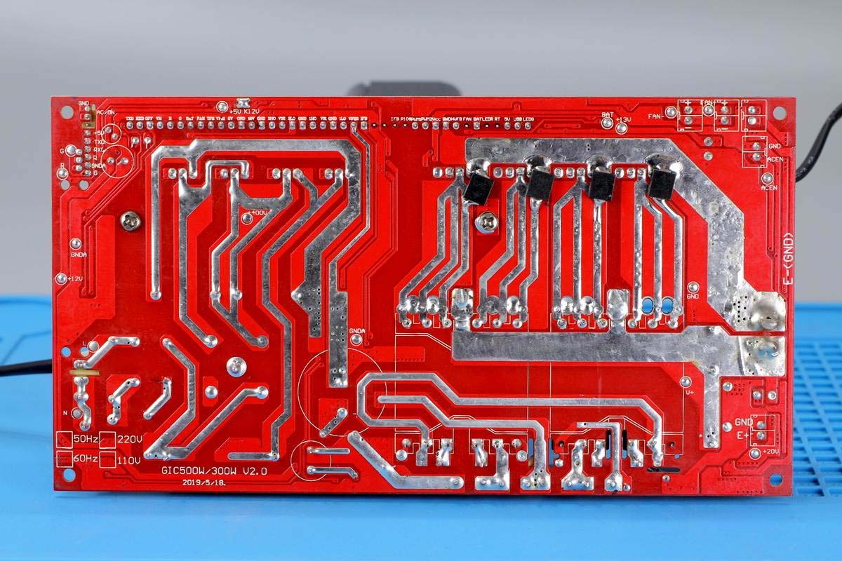 逆变器电路板背面大电流走线加锡,四颗黑色二极管在红色板子衬托下格外醒目。