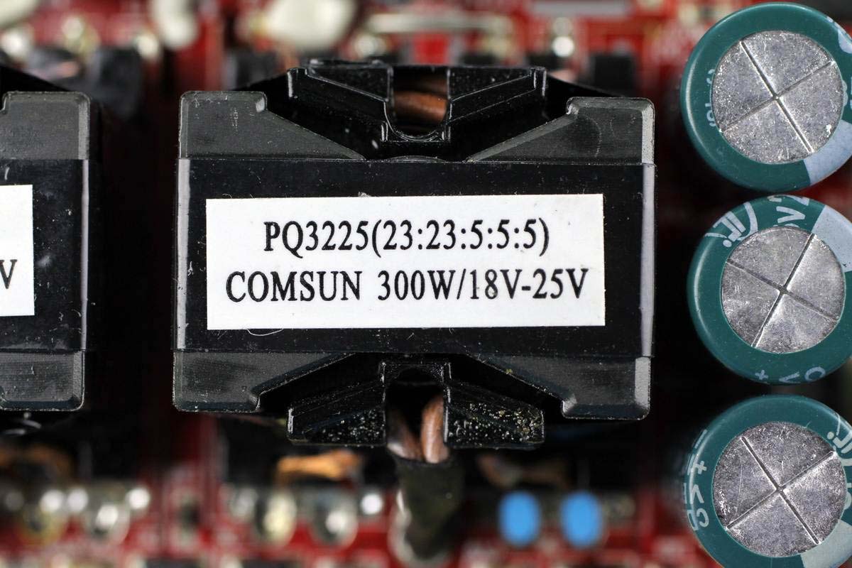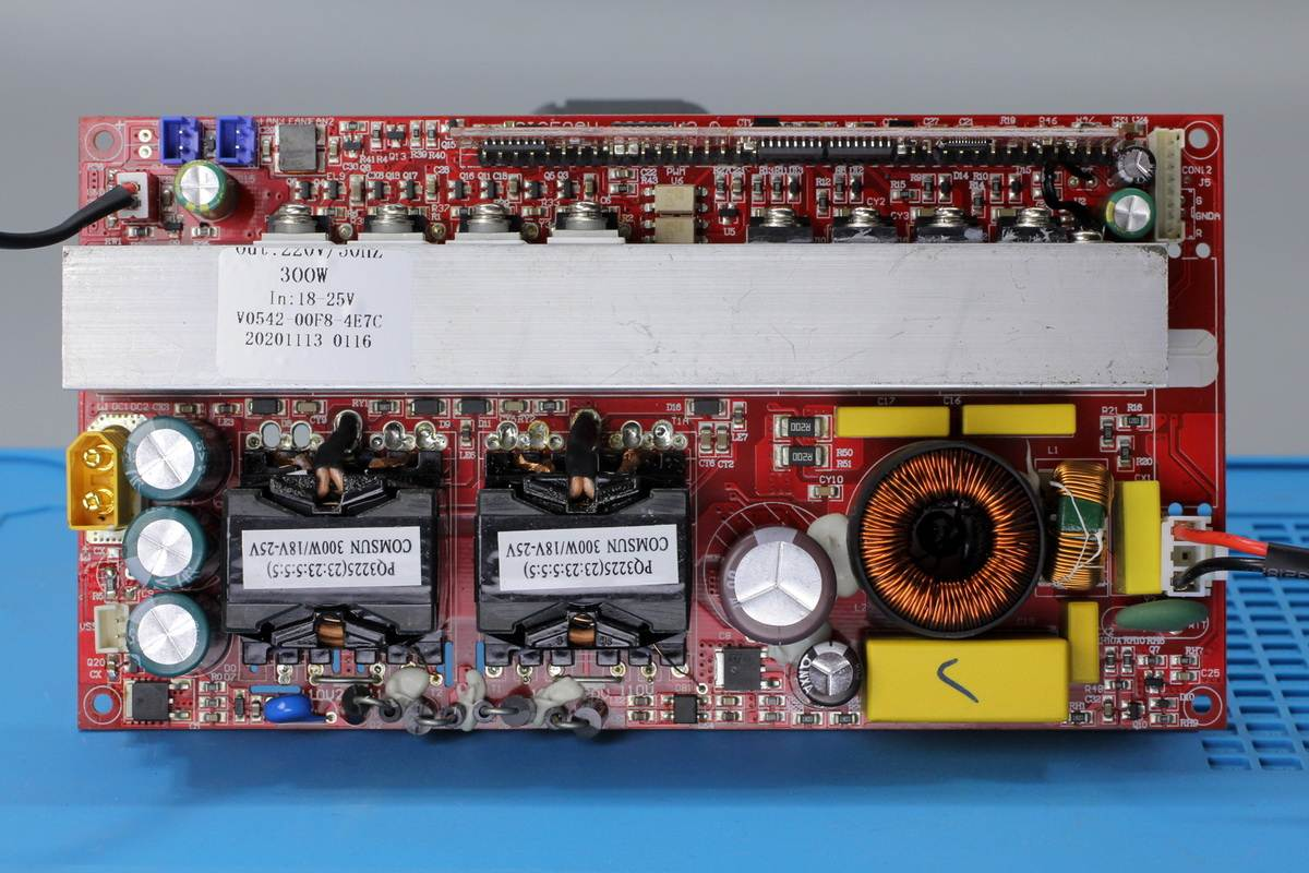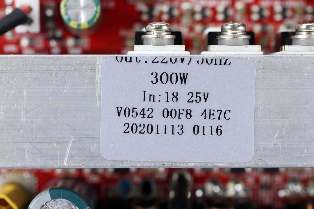 散热片顶部贴有贴纸,输出电压220V50Hz,输入电压18-25V,最大输出功率300W,2020年11月13日生产。