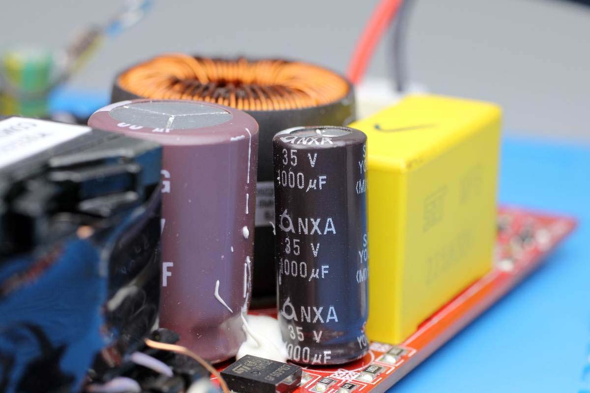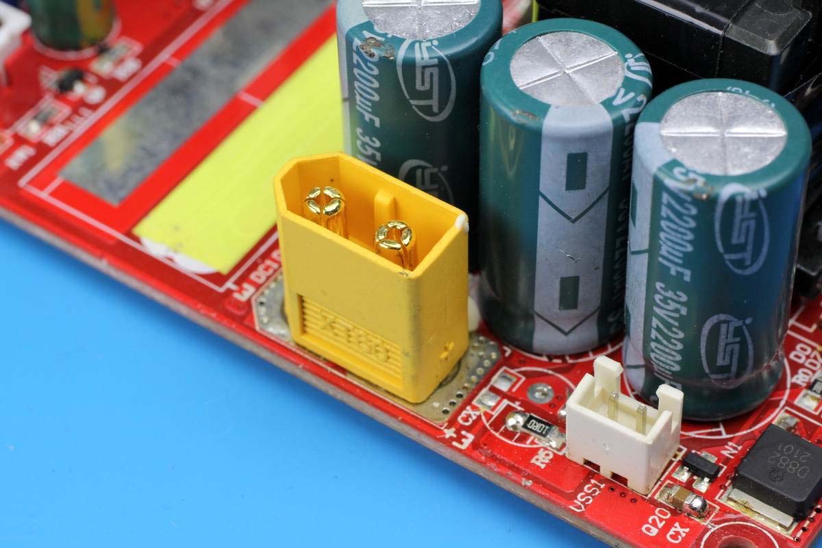 三颗输入滤波电解电容规格均为35V 2200μF。电池与逆变器采用XT60连接器连接。