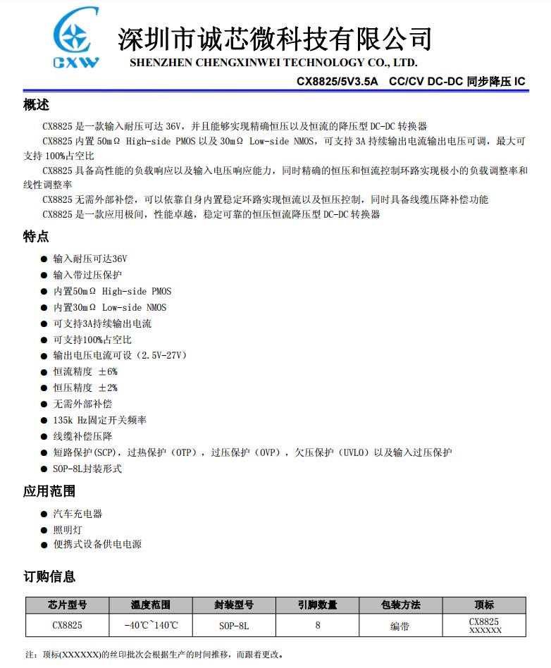 CX8852具备高性能的负载响应以及输出电压响应能力,同时精确的恒压和恒流控制环路实现极小的负载调整率和线性调整率。无需外部补偿,同时具备线缆压降补偿功能。这是一款应用极简,性能卓越,且稳定可靠的恒压恒流降压型DC-DC转换器。