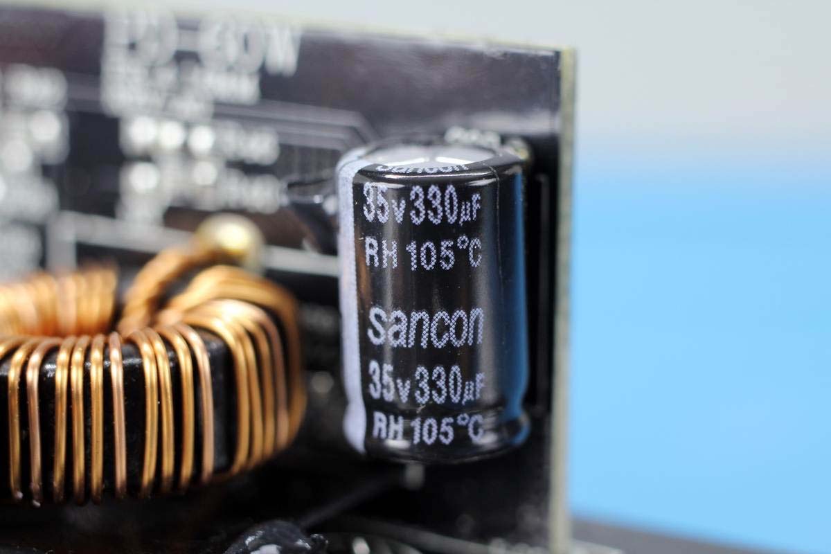 输入滤波电容规格为35V 330μF,sancon品牌。