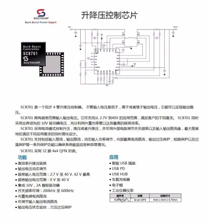 USB-C口同步升降压控制器采用南芯SC8701。这是一个同步4开关降压升压控制器,它可以有效地输出电压,无论是高、低或等于输入电压。同时也支持非常宽的输入和输出电压范围,它可以支持2.7V到36V的输入范围和2V到36V的输出范围。驱动器电压设置为10V,以充分利用外部mosfet实现最高效率,用于Type-C接口升降压电压转换。