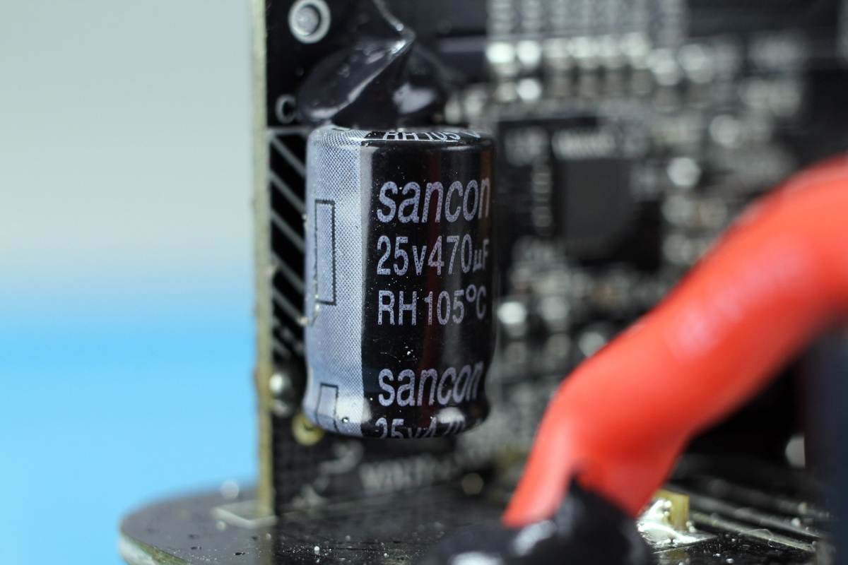 输出滤波电解电容规格为10V 100μF,也是sancon品牌。