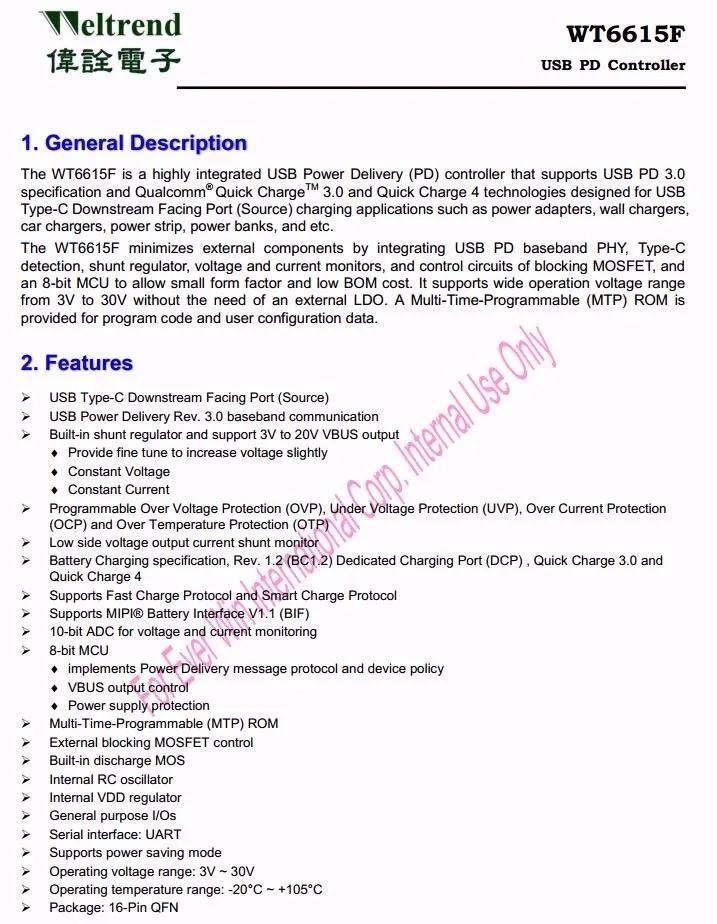 USB PD协议IC使用伟诠WT6615F。WT6615F是一颗支持USB PD 3.0规范和高通QC3.0和QC4技术的USB PD控制器,支持DFP下行端口(源)充电应用。