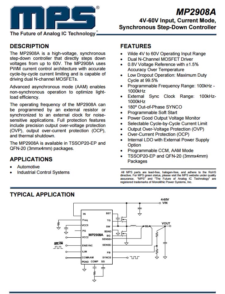 MPS MP2908A 4-60V输入的同步降压控制器,内置双NMOS驱动,支持低压差运行,支持可编程的软启动,支持逐周期电流限制。