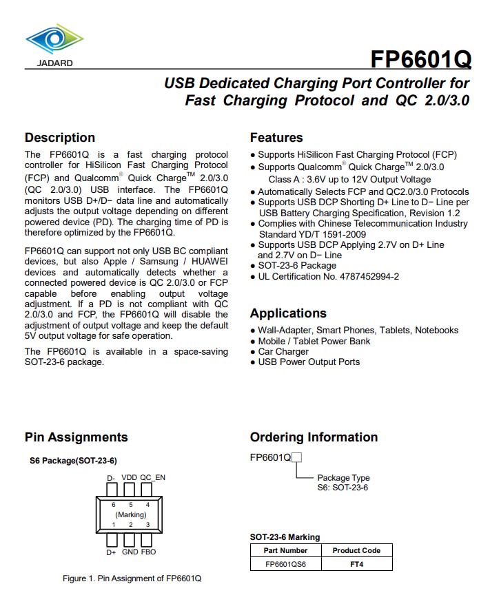 协议芯片来自天德钰,FP6601Q,用于USB-A口快充识别并调节输出电压。