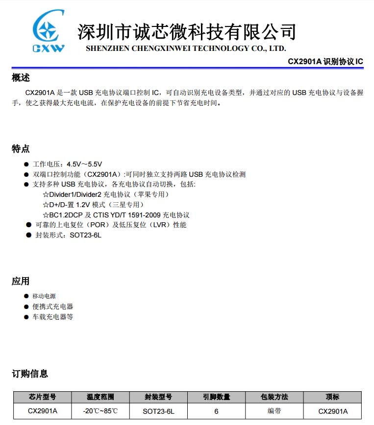 诚芯微CX2901A双路自动识别IC。这是一款USB充电协议端口控制IC,可自动识别充电设备类型,并通过对应的USB充电协议与设备握手,使之获得最大充电电流,在保护充电设备的前提下节省充电时间。