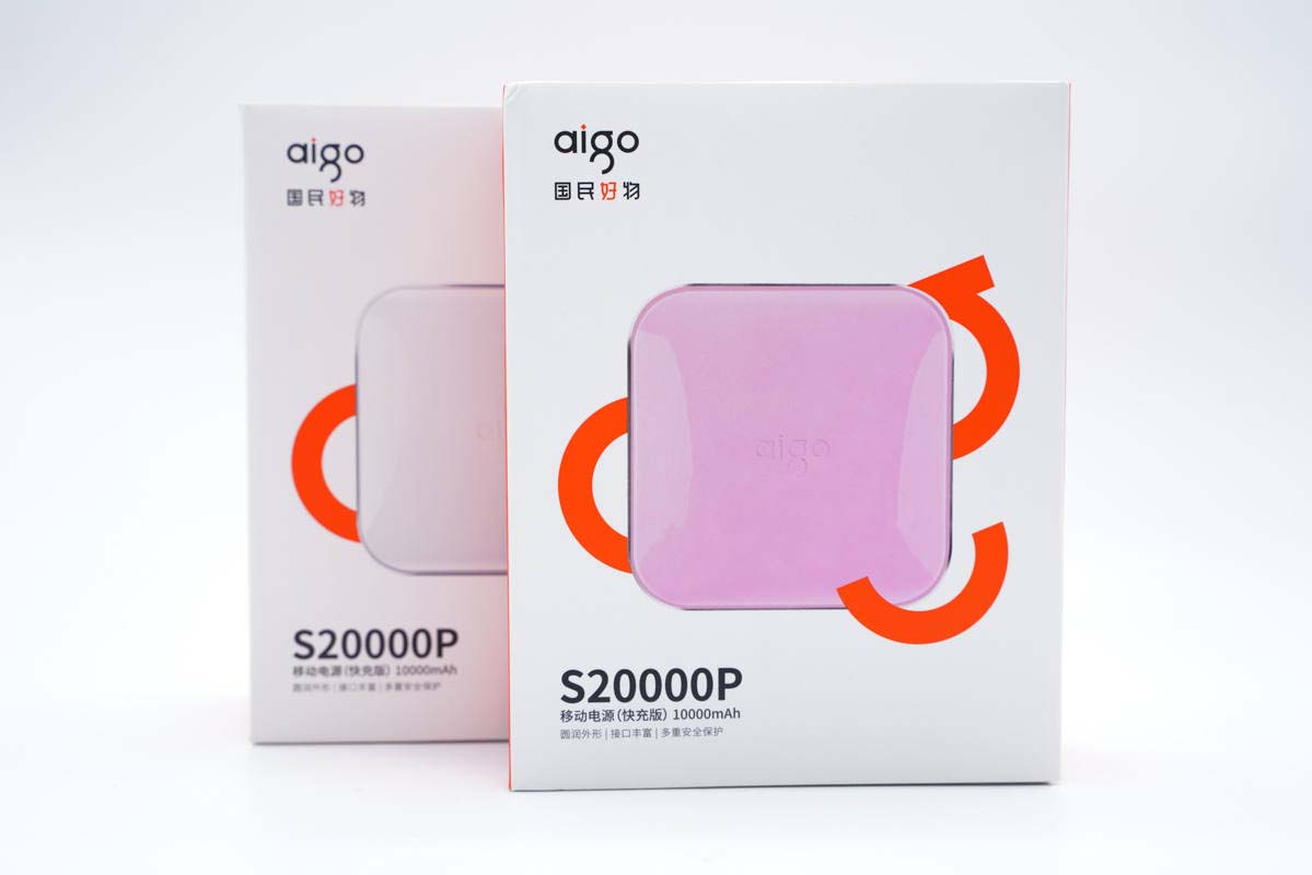 包装盒正面印有aigo品牌、产品名称和型号,中间是移动电源外观图,有粉、白、蓝款式。