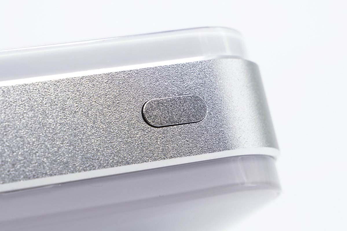 充电宝为方块造型,主体机身壳有双层,最外层透明亮面设计,晶莹剔透。侧身套有铝合金装饰环,两边倒角亮银处理。