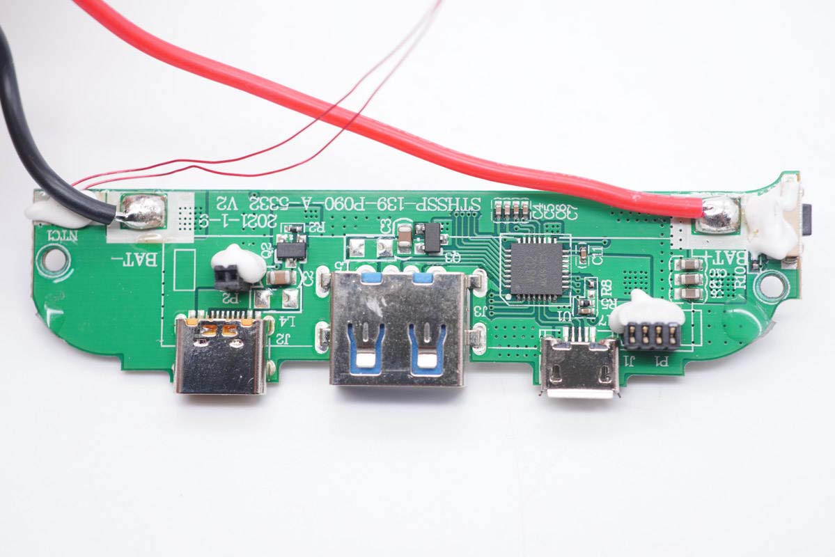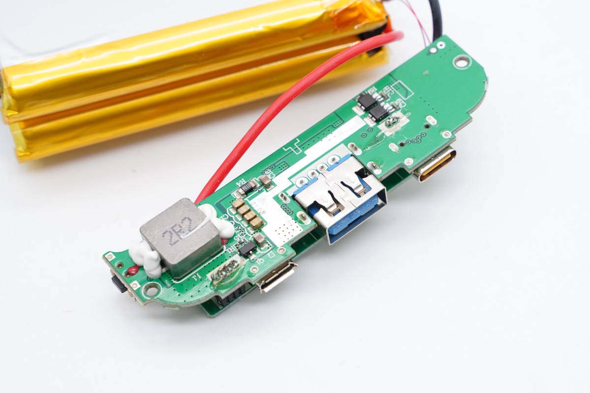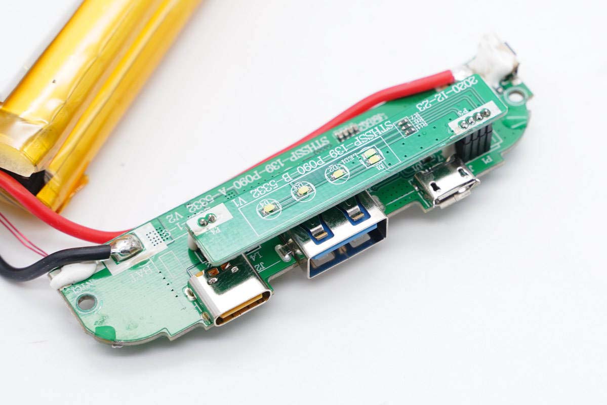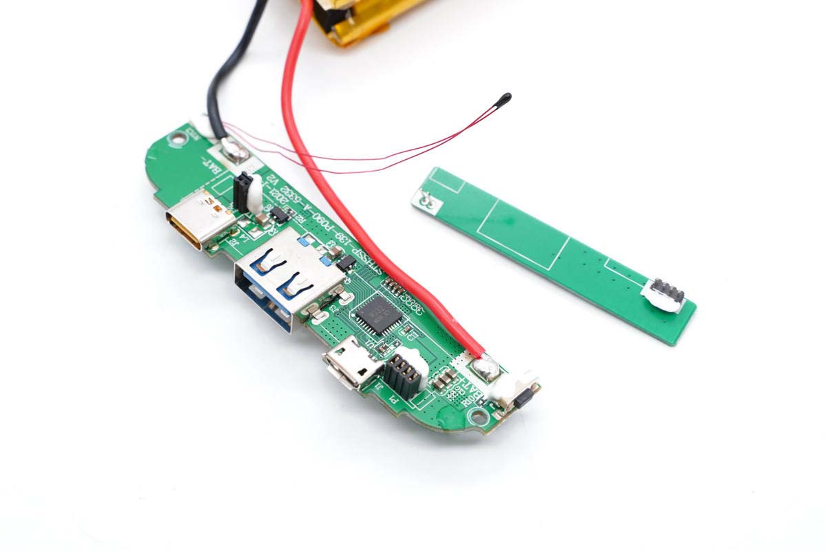 充电头网通过拆解了解到,这款移动电源内设两块小PCB板,主板上有英集芯IP5332主控芯片,控制三个USB接口的充放电,集成度非常高,电路也非常简洁。此外配有赛芯微XB7608保护电路和热敏电阻对电芯进行保护。主板上电感、电源键打胶加固。单独一块小板上焊接LED灯,还有快充指示灯,日常使用方便观察充电状态。总的来说,产品颜值高,小巧而性能实用,内部做工也讲究。
