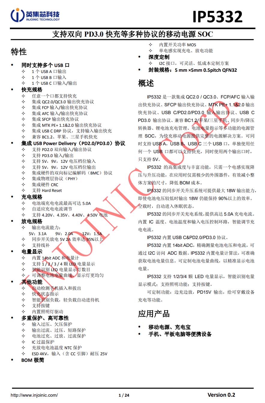 英集芯IP5332资料。充电头网拆解了解到,使用英集芯IP5332的还有绿联10000mAh双向快充移动电源、aigo 10000mAh双向快充移动电源,此外英集芯的快充芯片还被小米9手机27W原装充电器、机基地48W 1A1C USB PD快充充电器、第一卫30W USB PD快充充电器、京东京造18W USB PD充电器等数十款产品采用,并获得市场高度认可。